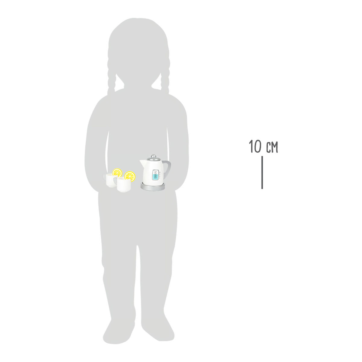 There's nothing like a cup of hot tea adorned with a juicy slice of lemon! Teach children the rules of service and social etiquette with the electric kettle and cups set. It perfectly complements children's kitchens, other tea sets, breakfast sets, or pretend pastries and desserts. The components are made from a combination of solid wood and strong plywood, offering high durability and longevity as a toy. Main features: kettle with lid and base, 2 cups, and 2 lemons robust and durable wooden construction