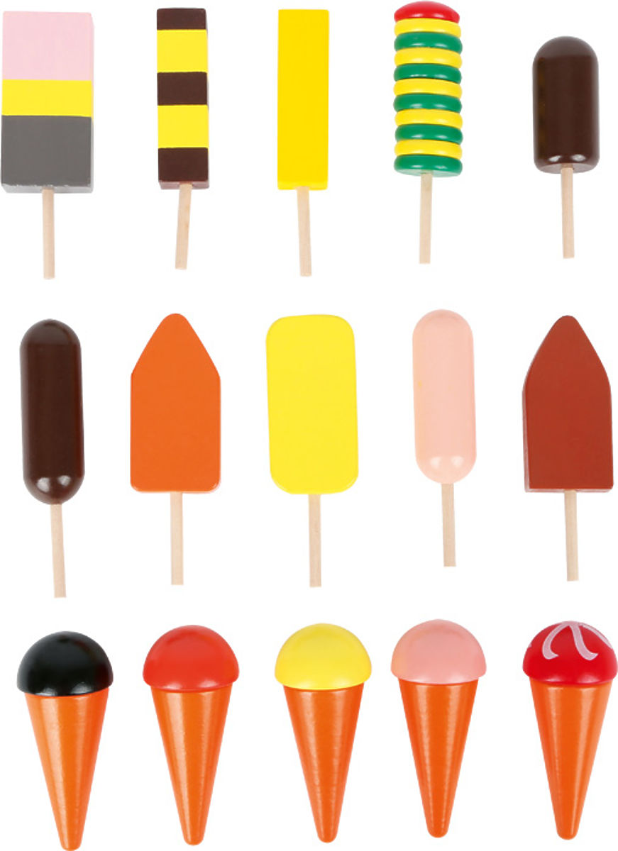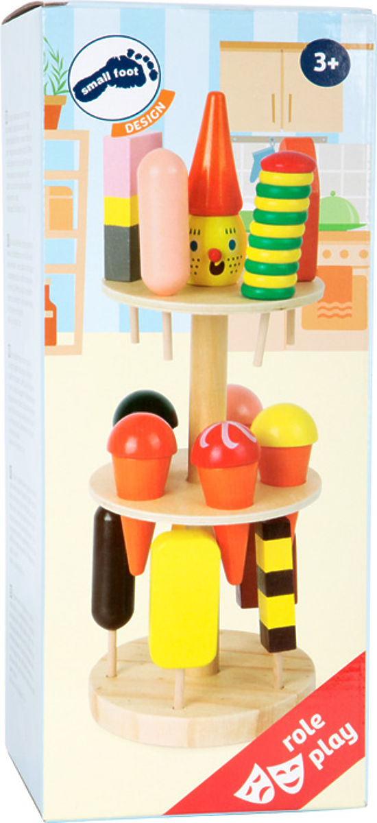 Damaged packaging. New product without defects. Children, come to the ice cream shop. This three-tiered stand has everything you crave. Ice cream on a stick or in a cone (8-10 cm) can be arranged in the prepared holes. This ice cream stand offers a total of 15 different and colorfully decorated ice cream flavors. It is made from color-glazed solid wood and plywood. Simply a "cool" accessory for children's kitchens or grocery stores. Main features: made of wood, contains 16 pieces, supports role-playing in kitchens and stores.