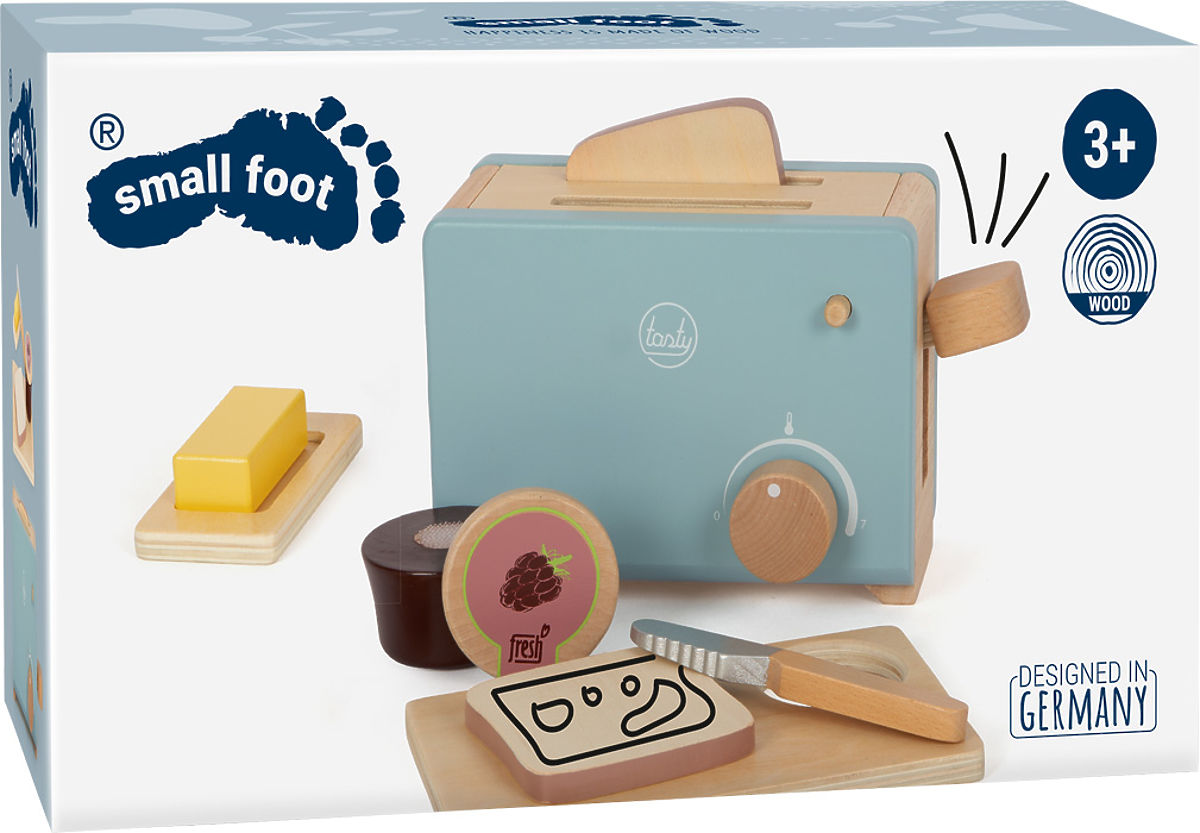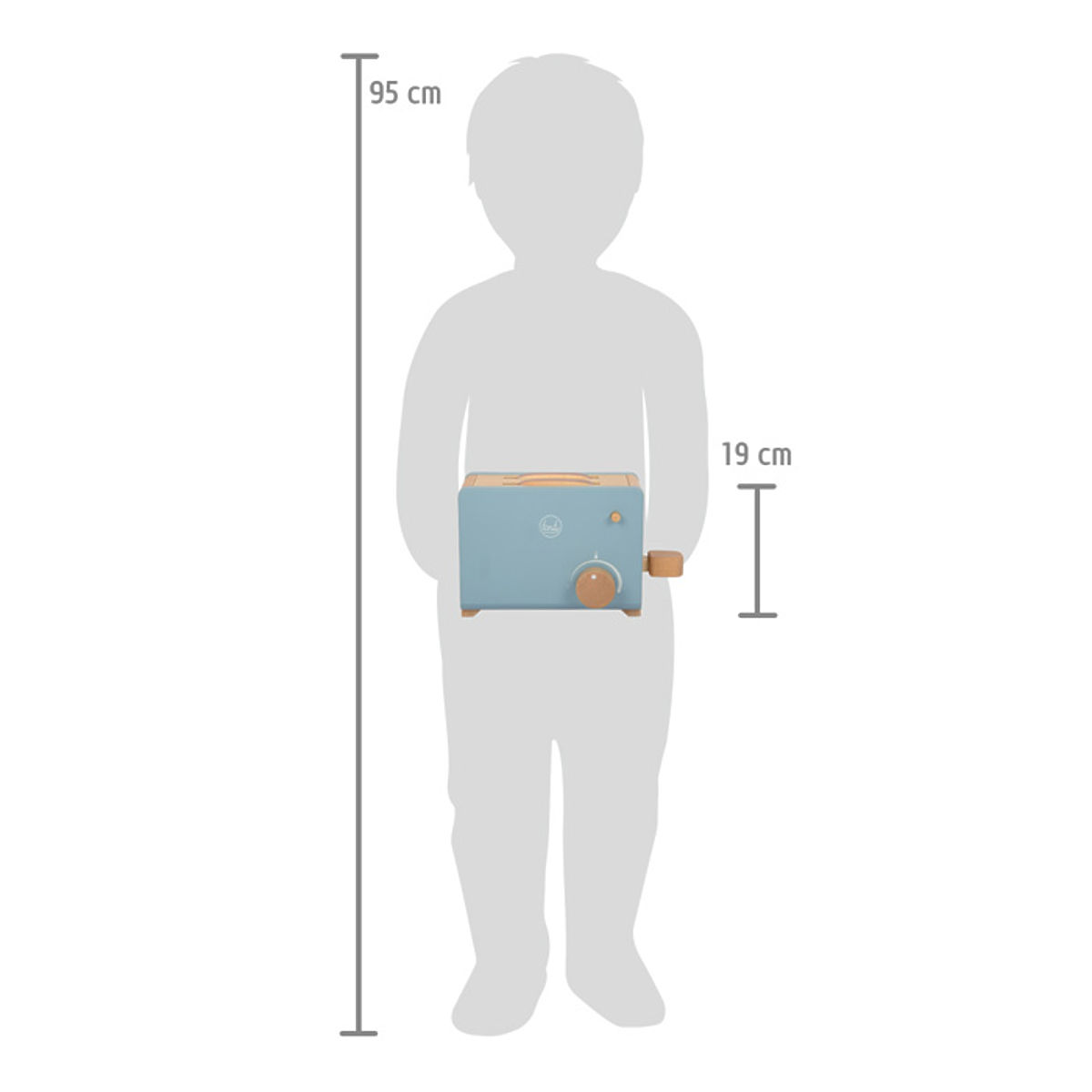 With this toaster and its accessories, every breakfast prepared in the children's kitchen will be a hit! It features a pop-up function and a gentle design in smoky blue and white, and the toy also includes a lot of natural wood. Among the rich accessories, you will find slices of toast bread, a knife, butter, and jam, which help in realistic play! The toaster has rotating and movable buttons and a lever. You can insert the toast slices into the toaster using the large lever on the side, and also eject them. With the rotating clicking button, children can set the temperature. The breakfast board can be hung thanks to a hole, taking up less space when stored. This set has a colorful design compatible with other products from the Tasty range by Small Foot, such as the Wooden Kitchen LE12216. Main features: wooden toaster with pop-up function, rich accessories – toast slices, knife, board, butter, jam, rotating clicking button, the board's cutout perfectly fits the jam, complements other products from the Tasty product line, trains everyday and social skills through imaginative play.