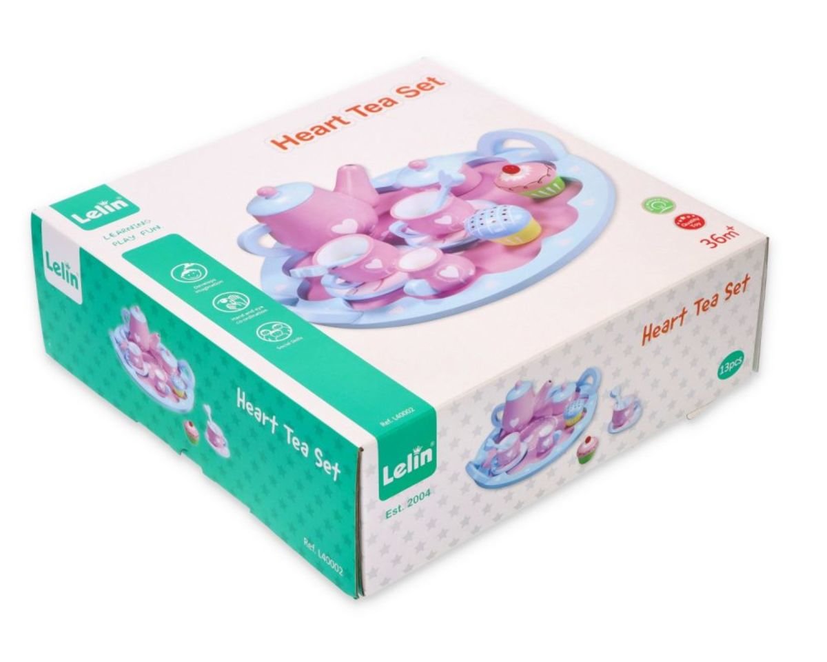 The set contains 12 wooden elements. Here you will find, for example, a beautifully decorated teapot, cups, a tray with handles and heart-shaped spoons. There are also two cute muffins in the set.