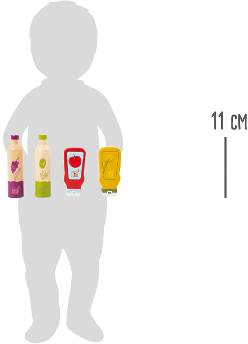 The perfect seasoning for a children's kitchen! The play set includes bottles made of high-quality wood in the typical colors of each product. Thanks to the distinct illustrations on the bottles, children can easily recognize their contents. The set includes vinegar, oil, ketchup, and mustard. Main features: the set contains 4 pieces, supports imagination and role-playing