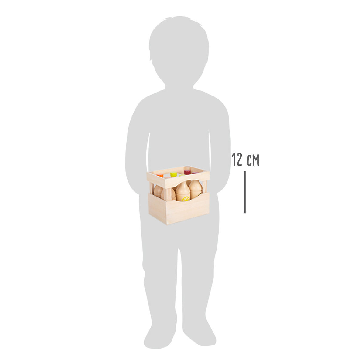 From the shelf to the shopping cart! This wooden crate contains 6 wooden beverage bottles. It includes 2 bottles each of orange, lemon, and cherry soda. They are perfect for a children's kitchen or sales stand. Thanks to simple illustrations, even the youngest children can understand the toy. Sturdy wood ensures long-lasting fun. Main features: contains 6 beverage bottles, made from solid wood for long-lasting fun, accessory for a children's kitchen or sales stand.