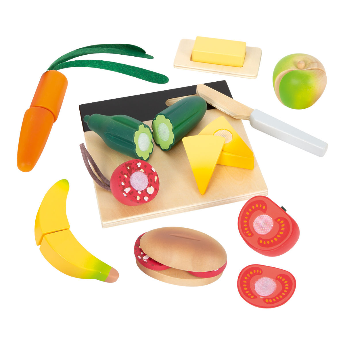 With this set of cutting food made from sturdy wood, children can play as chefs! It consists of common foods that children will easily recognize. The package includes a cutting board, a wooden knife, and a reusable bag that can be used to store the toy. One side of the board can be written on with chalk, so you can jot down a shopping list or recipe. Learning the correct cutting technique is really important, and with this toy, it will be a breeze. Tomato, cucumber, carrot, apple, banana, piece of cheese, salami, butter, and bread – it's all in this set! Naturally looking and detailed foods are held together with Velcro. Thanks to the sustainable packaging, children will learn something new about ecology. The cutting board can be hung up thanks to the loop. Main features: cutting foods made from sturdy wood, Velcro pieces, comprehensive set with board, knife, tomato, cucumber, carrot, apple, banana, piece of cheese, salami, bread, packed in a reusable bag, children learn something new about ecology while playing, one side of the board can be written on with chalk.