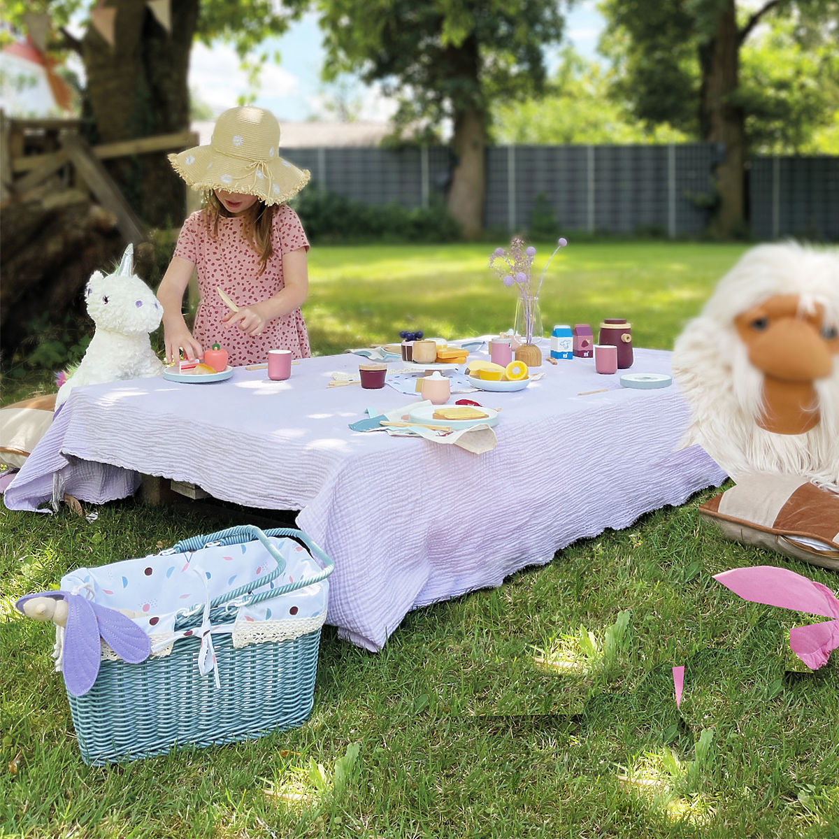 You can go on a picnic! This high-quality picnic basket with foldable handles and a picnic blanket will be a great accessory for your trips to the countryside or garden. The basket is woven from quality wicker and is equipped for 2 people. The dishes and food are made of solid wood. The orange and croissant are held together with Velcro. The inner lining of the basket can be removed and easily cleaned. This toy matches the color scheme of the "Tasty" kitchen and other products from this series. Children will enjoy imaginative play with it both indoors and outdoors. Some of the foods can be "sliced" with the help of a wooden knife. Main features: modern and robust wicker picnic basket "food" for two people handles can be folded blanket with the same motif included inner lining can be easily removed toy for role-playing in kitchens or picnics helps develop fine motor skills, social and everyday skills modern design combining white, natural wood, and trendy colors compatible with other products from the "Tasty" range