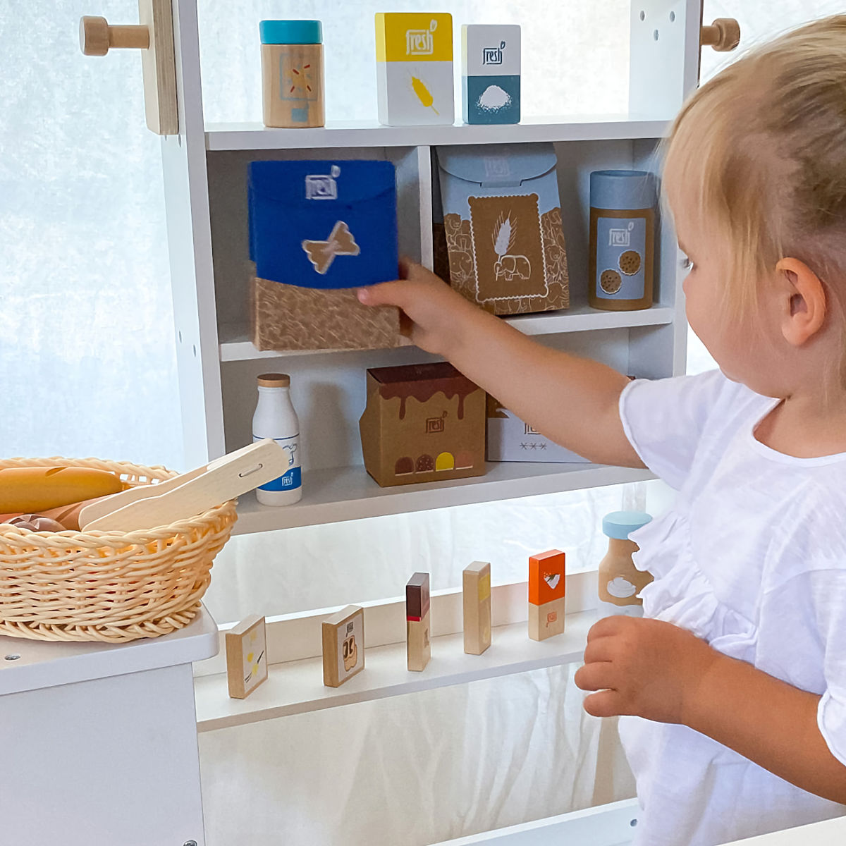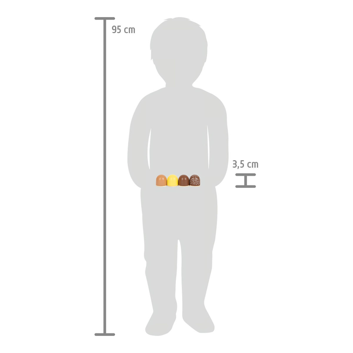 For little sweet tooths! These four sweet pralines with marshmallow inside are made of wood and will fit perfectly into children's market stalls and play kitchens. The package includes four varieties: white chocolate, dark chocolate, dark chocolate with sprinkles, and milk chocolate. Their natural appearance will delight children as much as their eco-friendly cardboard packaging. The marshmallow pralines look real and will serve children in imaginative play such as shop, picnic, or chocolate factory... Combined with other products from the "Fresh" line, they will enjoy real fun. Main features: four wooden chocolate pralines, white chocolate, dark chocolate, dark chocolate with sprinkles, milk chocolate, realistic design for imaginative play, untreated cardboard from which pralines can be easily removed, compatible with other products from the "Fresh" line.