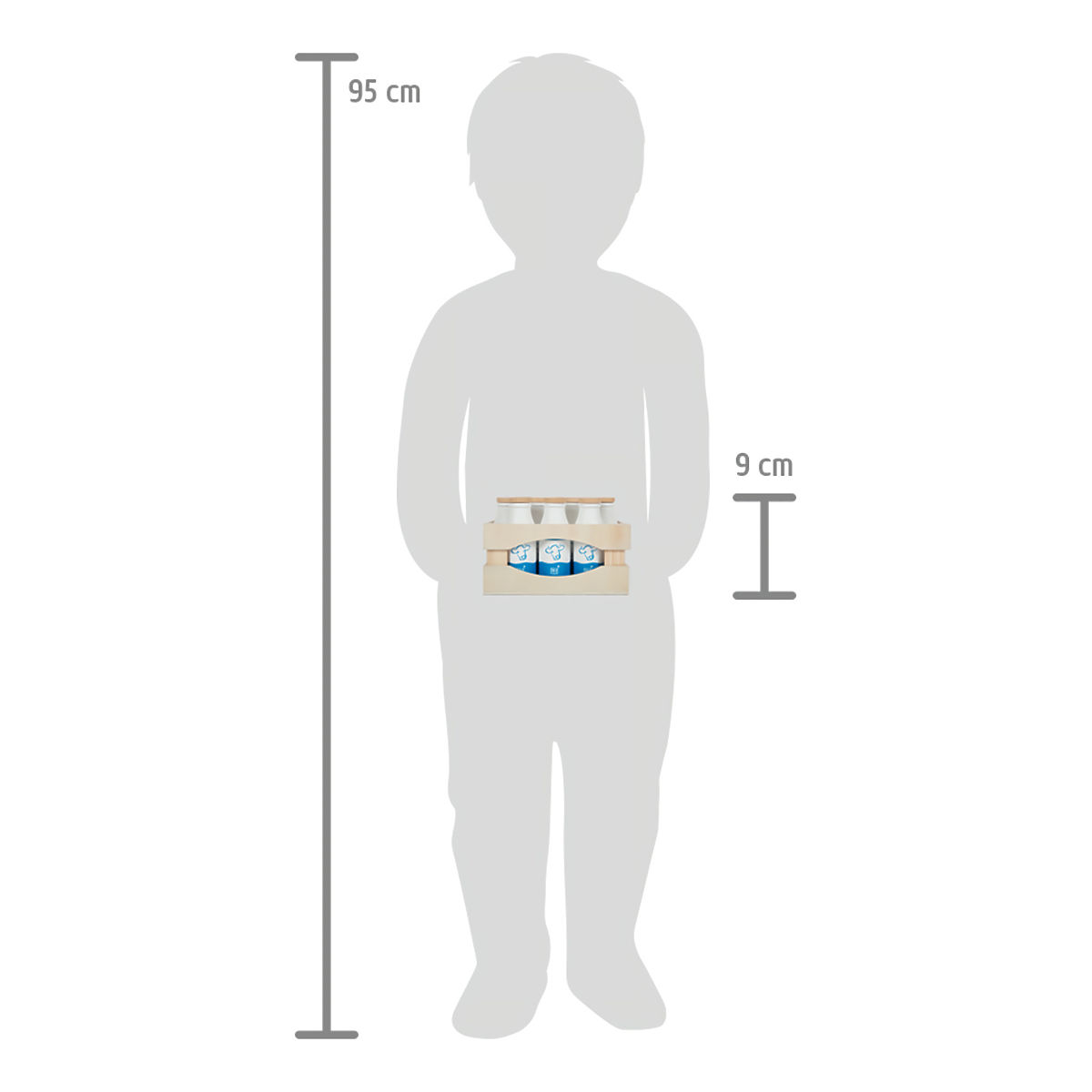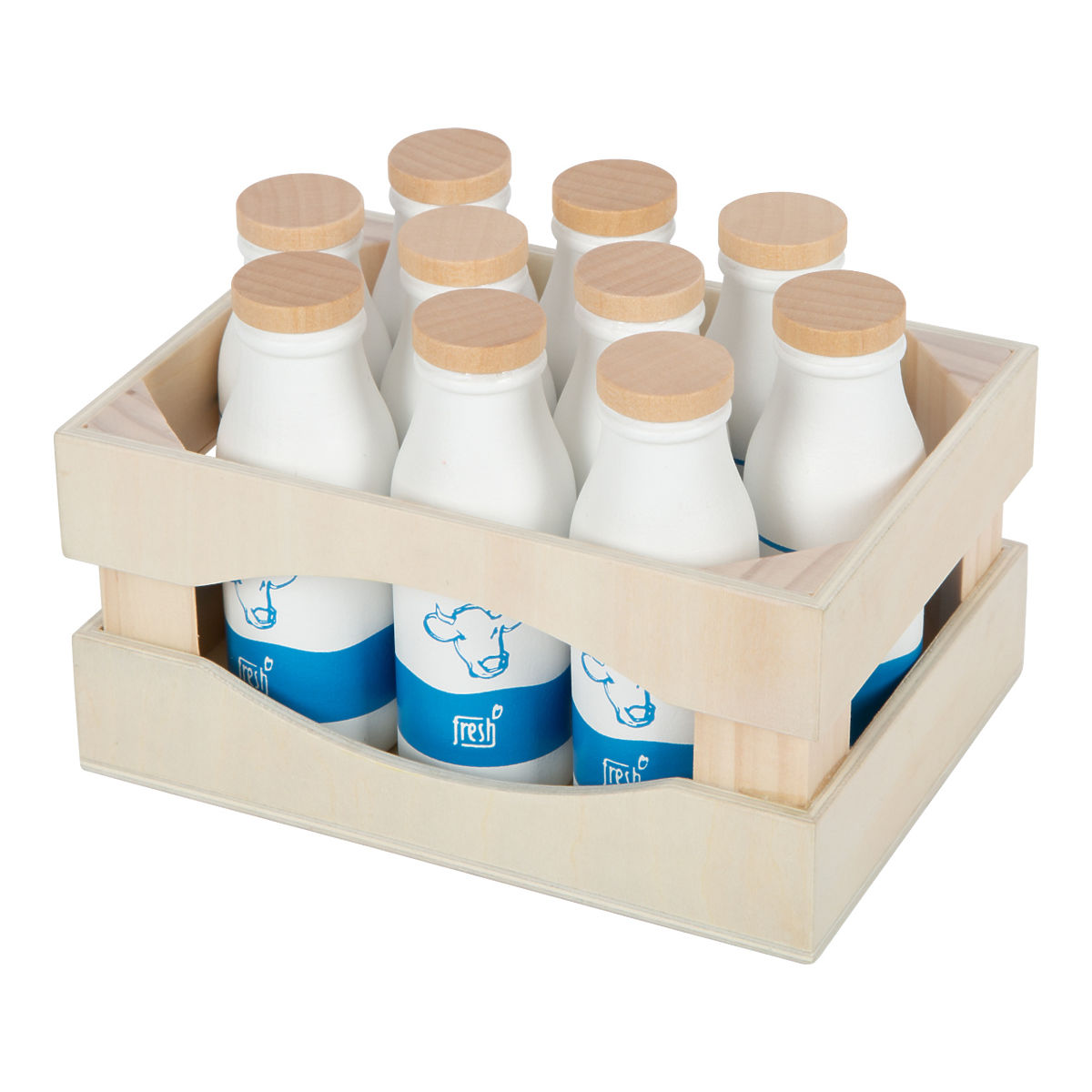 What would a children's market stall be without milk? The sturdy crate holds 10 milk bottles, making it perfect for realistic play in the kitchen or at the market. Thanks to simple illustrations, even the youngest children can easily understand it. Children can buy milk in the shop and cook meals with it. The toy encourages role-playing. Combined with other products from the "Fresh" range, they will have real fun. Main features: sturdy wooden crate with 10 wooden milk bottles, ideal accessory for children's kitchens and market stalls, realistic toy easily understood by even the youngest children, compatible with other products from the "Fresh" range.