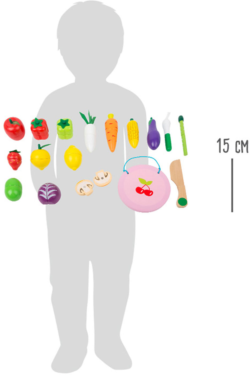Damaged product packaging. New goods without defects. This mix of fruits and vegetables has a lot to offer. Various types of fruits and vegetables are painted to look like real food. The individual pieces are held together by Velcro (except for the spring onion and asparagus). A toy cutting knife and wooden board are included. It's a tasty play experience that also encourages creativity and imagination. Everything can be safely stored in a practical cylindrical cardboard container. This set is a perfect addition to children's kitchens and stores. Main features: encourages creativity and imagination, also ideal for travel
