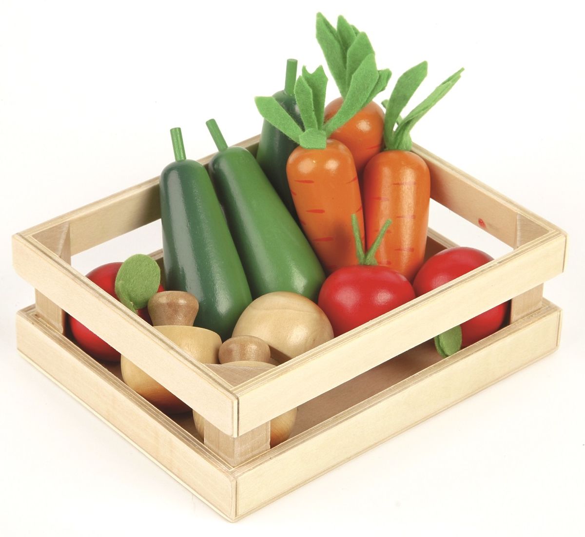This beautiful set of wooden vegetables has everything young aspiring chefs need to cook a healthy meal. The set includes mushrooms, carrots, zucchinis, and tomatoes. The vegetables come in a handy wooden crate and are compatible with the Tidlo shop and theater. Everything is authentically detailed. This play set is perfect for any budding young chef or shopkeeper. Children can learn and start recognizing the names of the foods they consume. It's a great way to teach young children about the importance of a healthy and balanced diet, where our food comes from, and how we prepare meals. A great way to encourage interactive and imaginative role play and develop social skills and dexterity. Made from high-quality and responsibly sourced materials. Main features: authentically detailed, encourages creativity and imagination