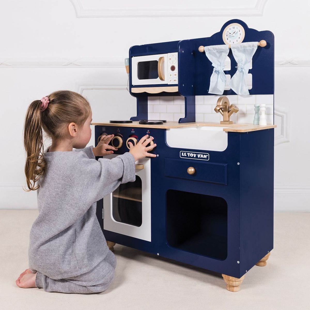 The Oxford Kitchen is made from sturdy and sustainable wood, with an original design that makes it a unique piece. It is painted in a royal blue shade, with copper-colored details. This traditional toy will fit into any child's room, inspiring children to engage in imaginative role play. Its features include an oven with opening doors, turning knobs, a sink, a microwave, a cute window with curtains, and a clock with movable hands. The package also includes a whisk, a spoon, a salt shaker, and a pepper shaker. Everything for little chefs. You can equip the kitchen with food and accessories from the Honeybake collection by Le Toy Van. A beautiful toy that can be passed down from generation to generation. Toys with a purpose: All Le Toy Van toys are made to last. Designed with love by experienced craftsmen using ethical practices and sustainable materials that are kinder to our planet. Main features: wooden kitchen with accessories ethically made from sustainable wood tested to the strictest standards painted with non-toxic water-based paints inspires creative and imaginative play helps develop language and social skills supports early development Honeybake collection: Toys in this collection are suitable for exploration, helping children develop imagination, social and verbal skills, and cognitive functions. Traditional design with modern details will surely entertain children. Honeybake is Le Toy Van's most award-winning collection, recognized for design, quality, safety, and educational and play value.