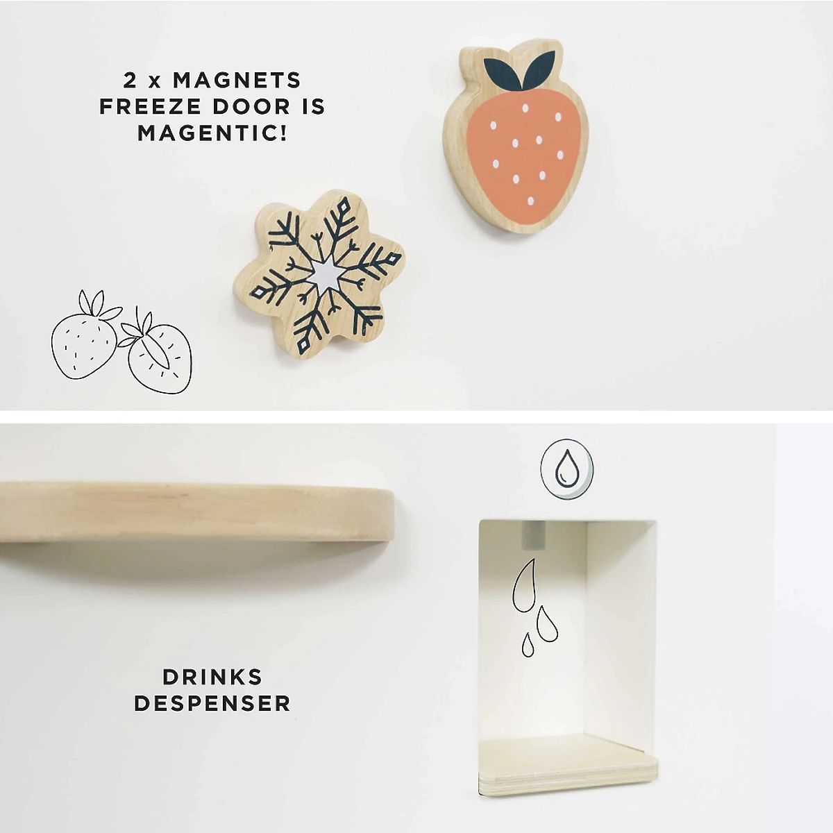 Enhance your play kitchen with this amazing free-standing fridge with freezer! This durable toy with an appealing retro design is full of interactive features for more fun and imaginative role play. Discover the built-in water dispenser, temperature control, and fruit and vegetable compartments. The complete set also comes with a range of accessories including 2 popsicles, a stand, egg and ice trays, and a bottle for milk or smoothie. The fridge doors are magnetic and come with two practical, decorative magnets. The fridge is compatible with the large Le Toy Van kitchen (code TV347). The set is made from FSC® certified wood (wood from sustainably managed forests) and decorated with child-safe water-based paints. Purposeful toys: All Le Toy Van toys are made to last. Lovingly designed by experienced craftsmen using ethical practices and sustainable materials that are kinder to our planet. Key features: ethically made from FSC sustainable wood, painted with non-toxic water-based paints, tested to the highest standards, includes fridge with freezer, 2 magnets, ice cube tray, egg tray, 2 popsicles, 2 bottles, water dispenser, inspires imaginative play. The FSC® (Forest Stewardship Council) brand and certificate guarantee that the wood used to make the product was not illegally harvested and comes from forests managed in an environmentally and socially responsible manner. The FSC® label on the product means that your purchase helps protect forests and supports sustainable, responsible, or nature-friendly management, making our forests more stable, healthier, with a natural species composition, and better able to withstand the negative impacts of climate change.
