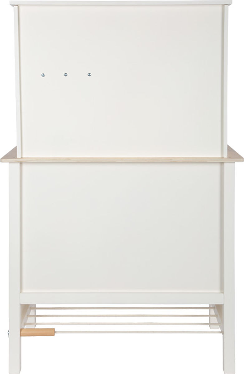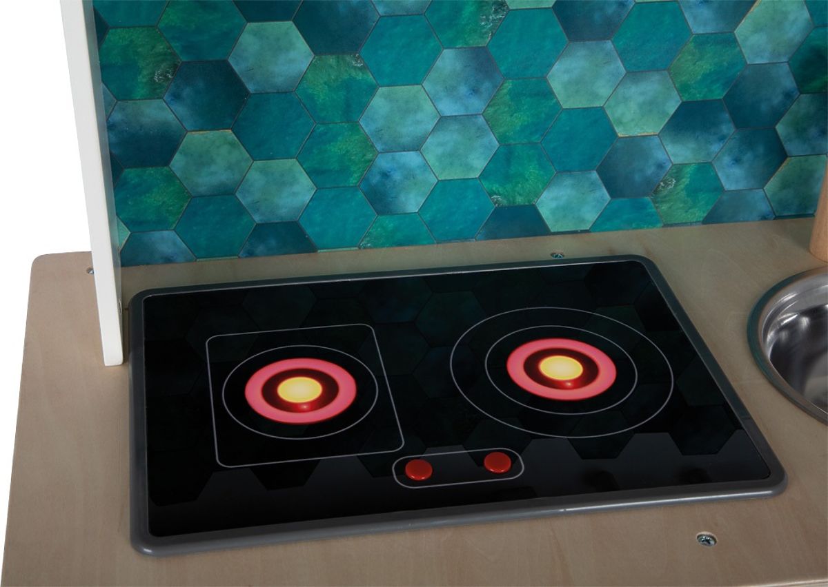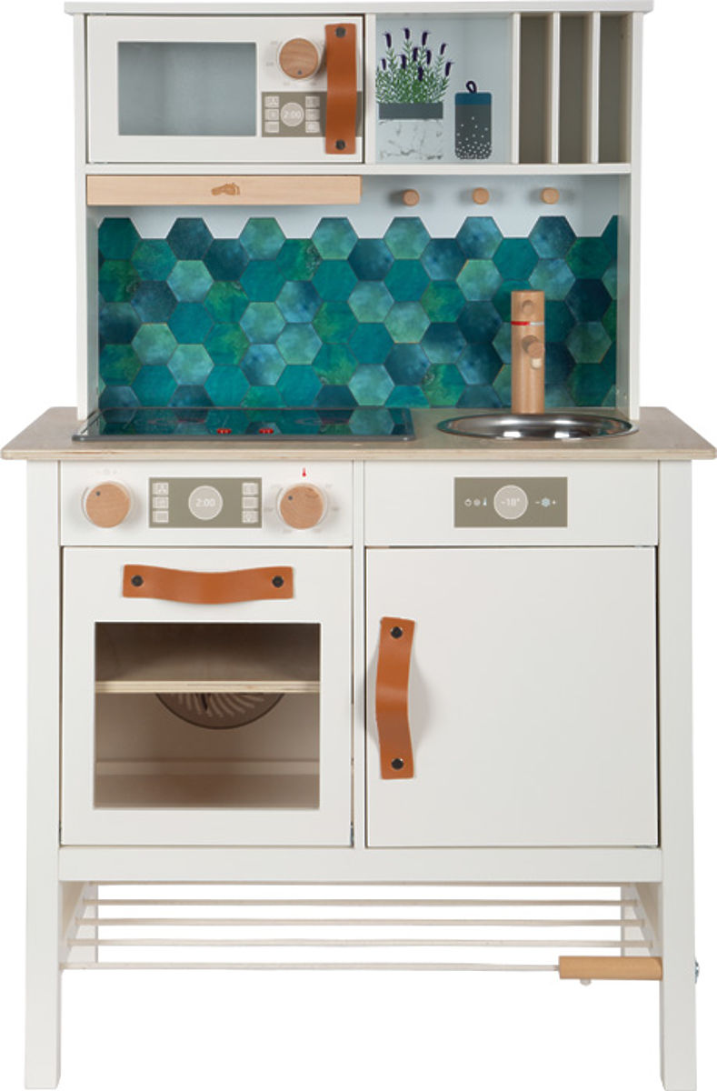 The video is for illustrative purposes only. A modern children's kitchen with a robust construction in trendy white color combined with stylish cognac-colored leather handles. Instantly ready for play with the included pot with lid, pan, and metal kitchen utensils. It comes with a metal sink and rotating knobs that make a sound. Includes an electronic stovetop with light and sound and a retractable hood with a light symbol. The removable baking tray can also be used as a drawing board. Surfaces in the refrigerator and oven are printed with kitchen details for more fun during play. Double-sided back panel with high-quality print in a tile look or simple white color. Can be perfectly complemented with other products and kitchen appliances from the Tasty collection. Main features: metal accessories and utensils, functional elements like clicking knobs, stovetop with light and sound effect, new modern design, power supply - 2xAA batteries (not included), can be complemented with products from the Tasty collection.
