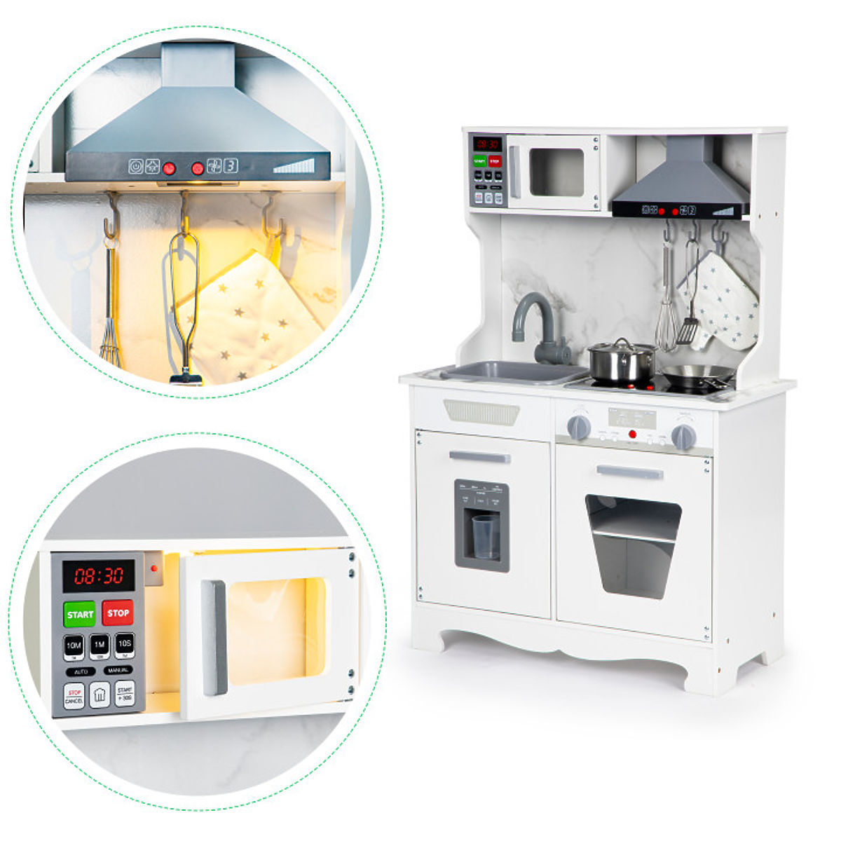 LIKE IN A REAL KITCHENOn the refrigerator door, there is a water dispenser and an ice maker. The kitchen set includes a mug and two wooden blocks that perfectly imitate ice cubes. Simply place the mug in the ice maker window and gently press the element responsible for ice dispensing, and an "ice cube" will fall into the mug.