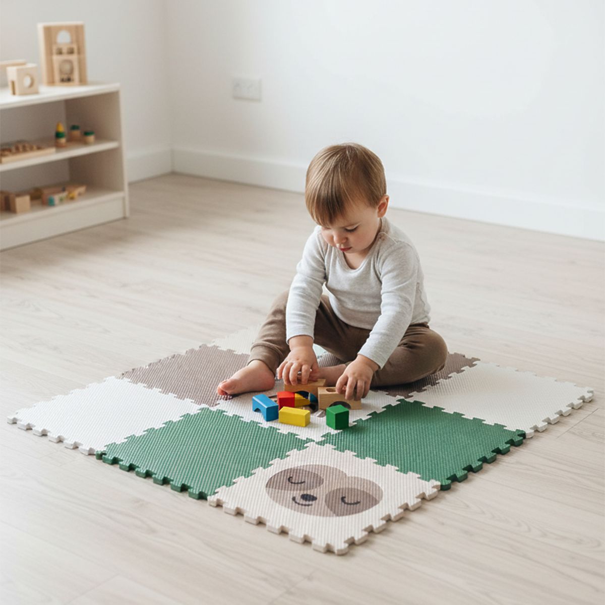 The MINIDECKFLOOR foam floor creates a soft, warm, and safe space for play and relaxation. You can easily assemble the pieces like a puzzle and have it ready in no time. The combination of several colors and motifs gives the room a modern and playful look.