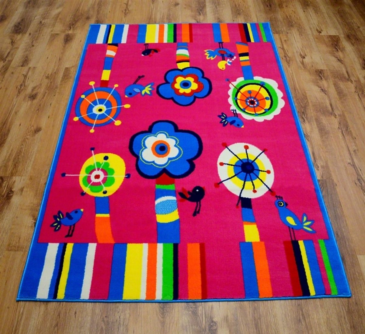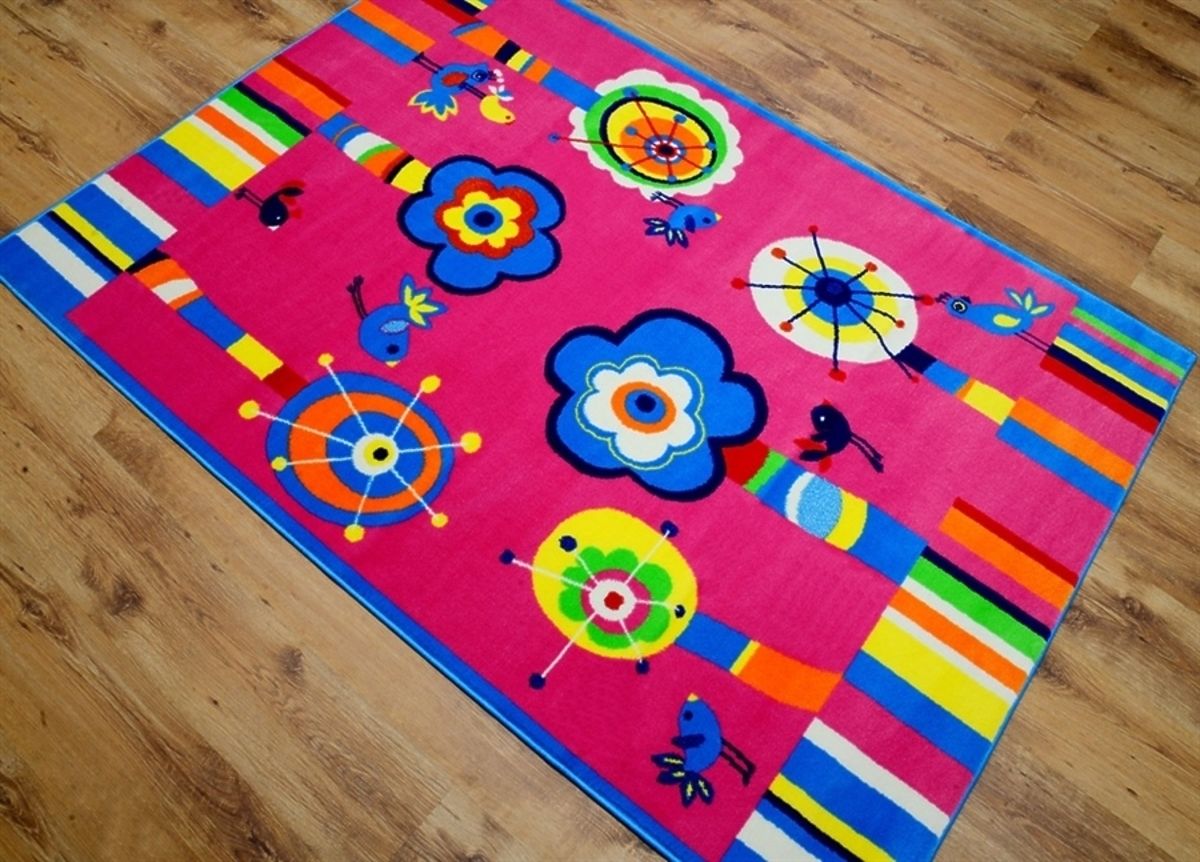 Vibrant, colourful, fun, that is this good-quality children's rug with a happy garden motif. It features flower and bird motifs that can make every girl's bedroom look cosier and more fun. The rug is made of heat-set polypropylene fibres and the backing is rough canvas.
