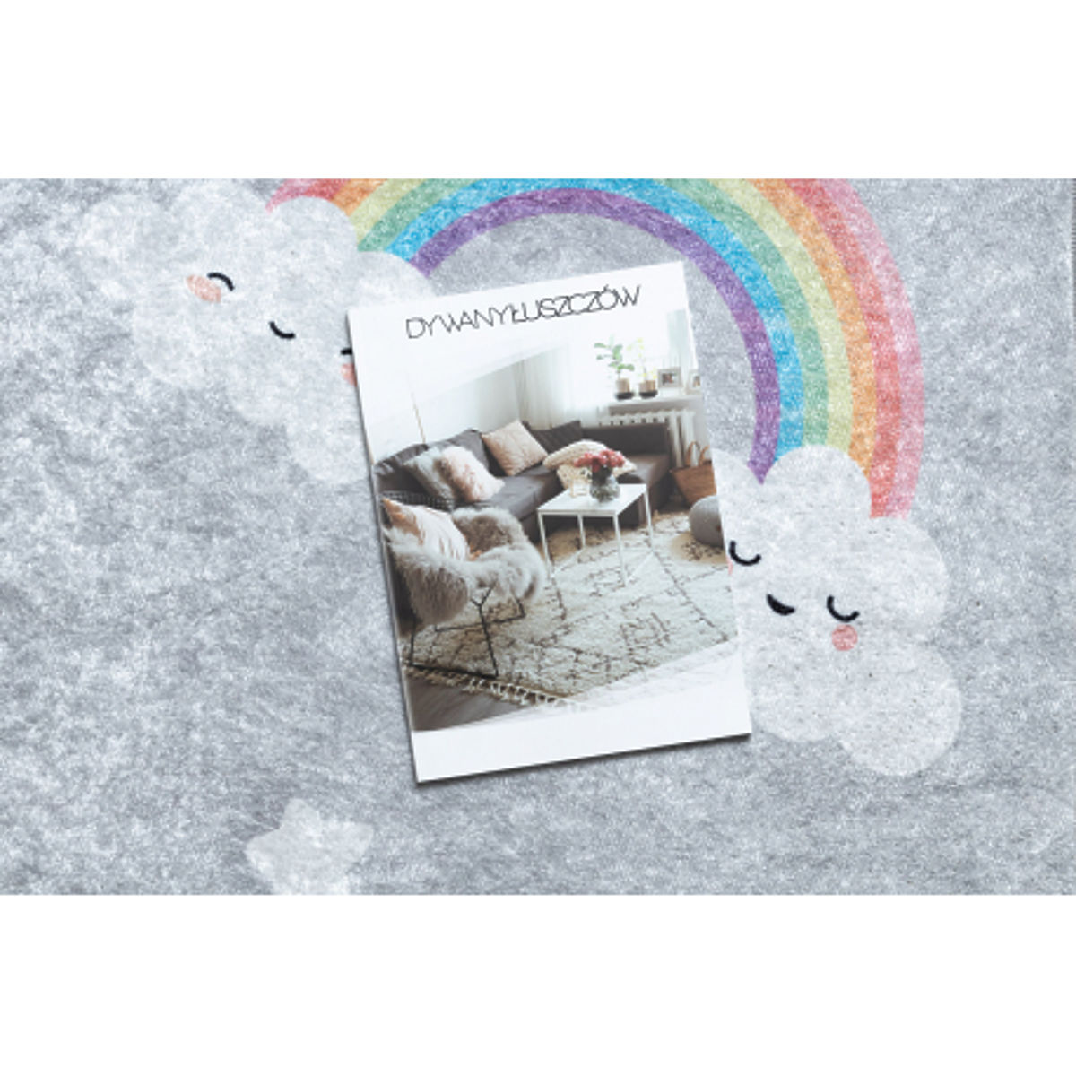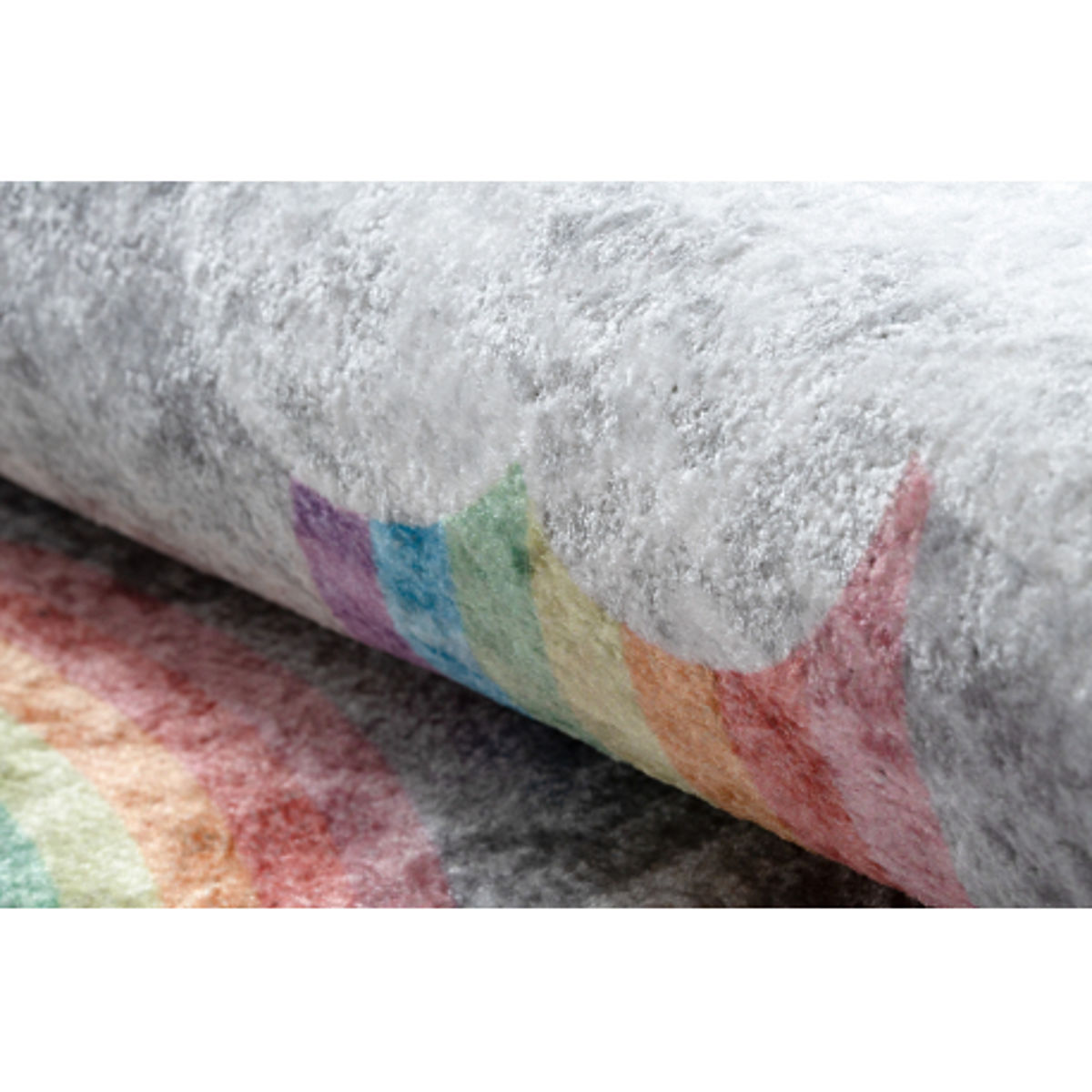 Revitalize a child's room with the playful and colorful JUNIOR rug featuring a rainbow and cloud motif. The elegant grey design complemented by a cheerful pattern stimulates children's imagination and brings joy and coziness to the space. The rug is soft and pleasant to the touch, safe with its anti-slip backing, and easy to maintain – it is machine washable. A great choice for a playroom, children's room, or relaxation corner.