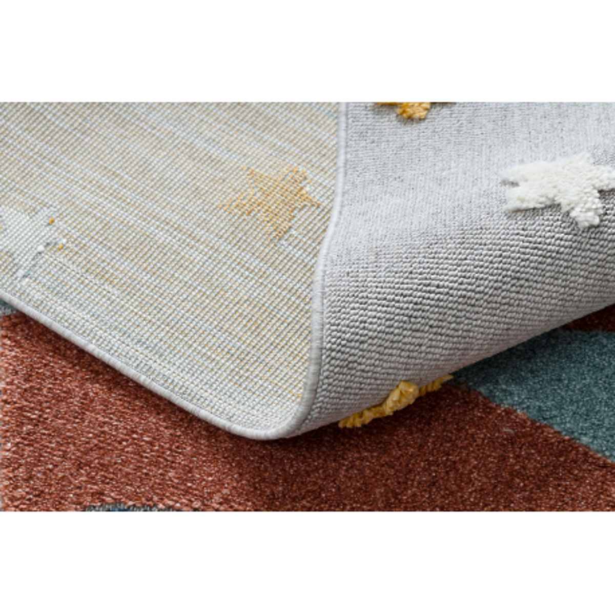 The carpet has a textured surface with fringes, which stimulates tactile and visual perception and encourages children's creativity and curiosity. Thanks to the quality polyester yarn, the carpet is soft, lightweight, and easy to maintain. The thickness of the carpet ranges between 8 mm and 16 mm, providing comfort for both play and relaxation. The weight depends on the pattern and ranges between 2.0–2.50 kg/m².