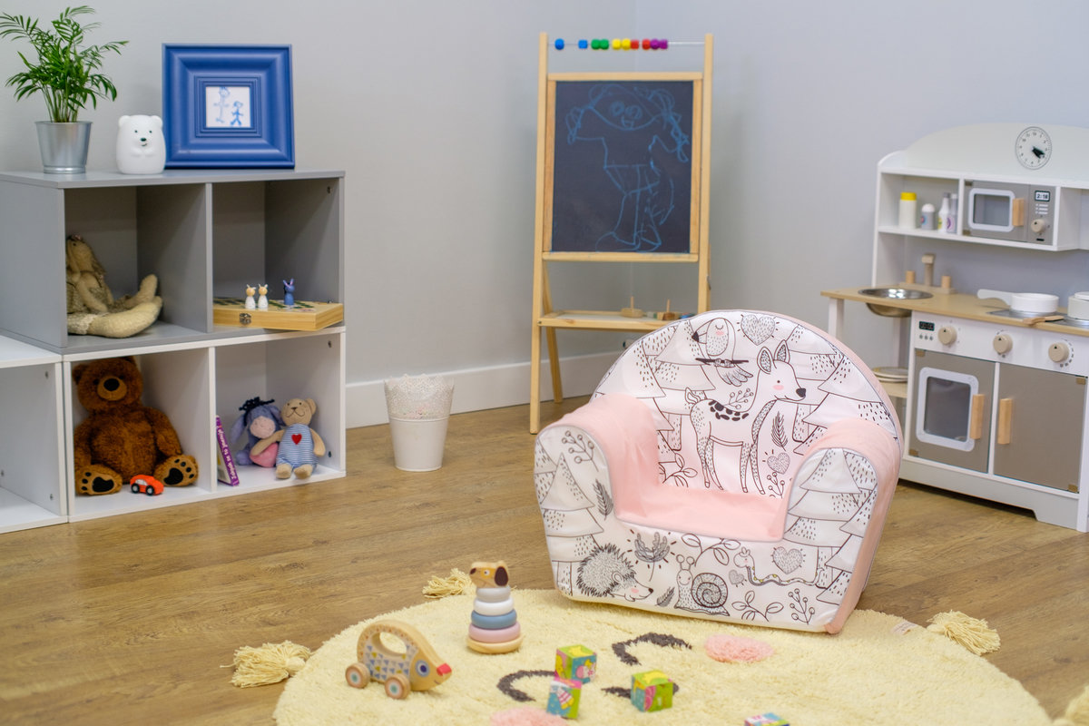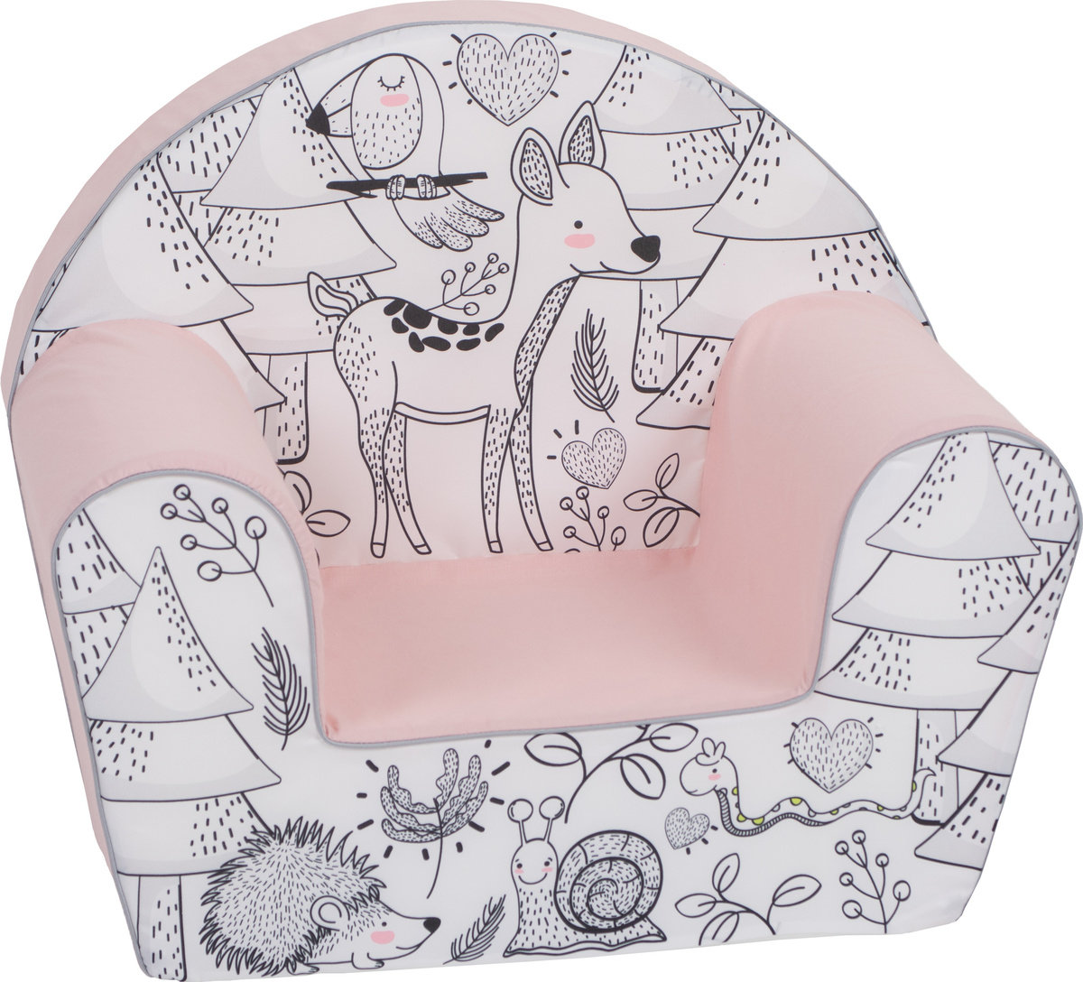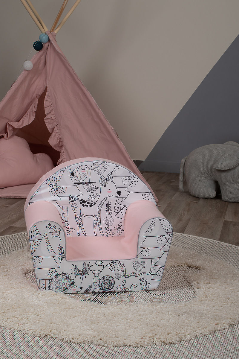 Colorful armchair with the motif of fawn and forest animals. The combination of pink fabric and black and white print is suitable for a girl's room. The children's chair is made of soft and lightweight foam. This ensures that it is safe and practical for everyday use.
