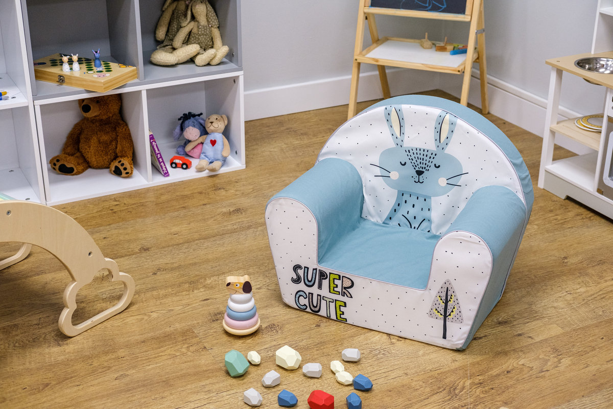 Colorful armchair with the motif of a dreaming hare. A cute armchair with a picture and the inscription SUPER CUTE . The children's chair is made of soft and lightweight foam. This ensures that it is safe and practical for everyday use.