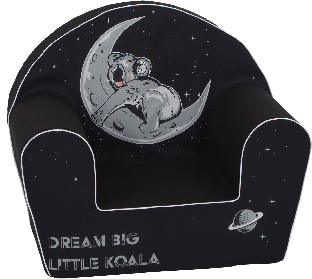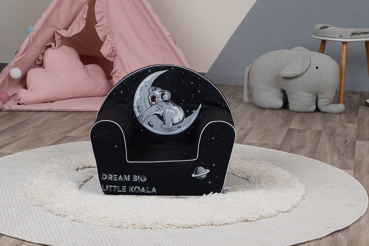 The black armchair with the motif of a koala dreaming on the moon fits into any interior. On the front of the chair is the inscription DREAM BIG LITTLE KOALA . .. more