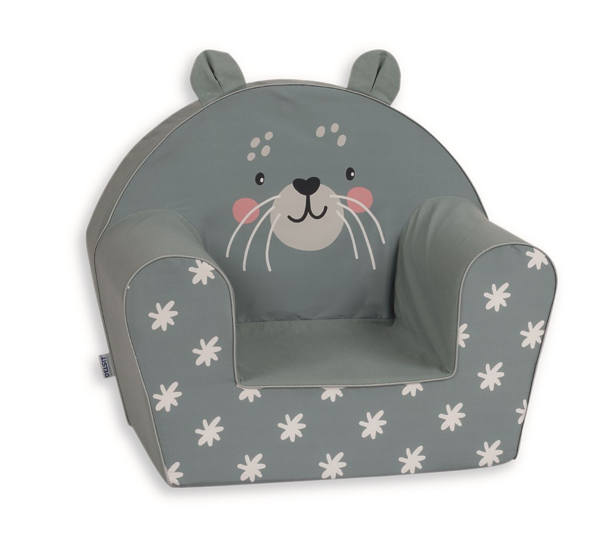 Gray children's armchair with playful otter motif and small ears. .. more