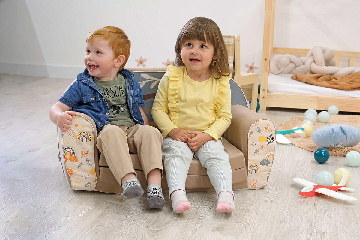 When unfolded, the sofa reaches dimensions of up to 80 cm and is specially designed to provide comfortable seating for two children. It is ideal not only for a child's room but also for kindergartens or play areas, where it brings colorful joy and comfort during play and rest.