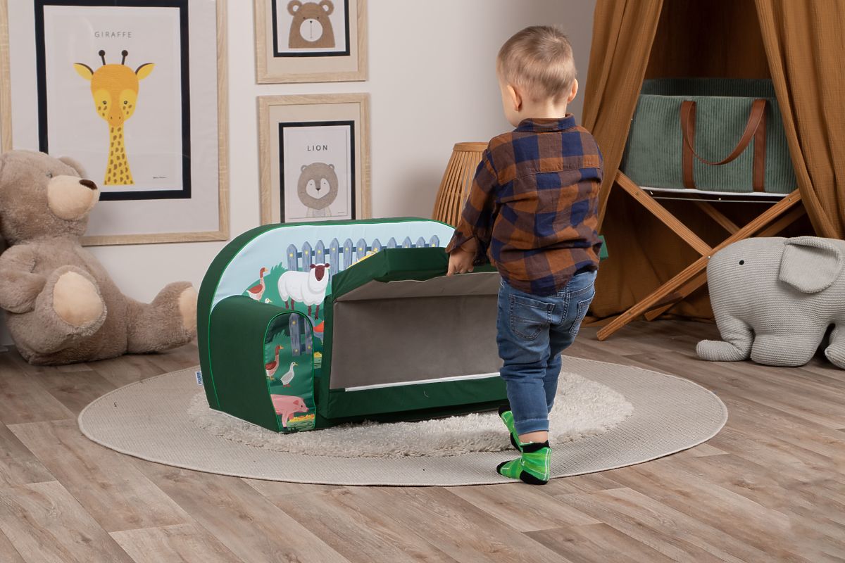 The sofa with a cheerful motif of a cow, sheep, pig, and other animals transforms any child's room into a small farm full of comfort. Thanks to its soft foam filling, it is ideal for safe play, relaxation, or reading favorite books. The removable cover made of pleasant and durable fabric is easy to maintain, allowing children to enjoy comfort and parents peace of mind.
