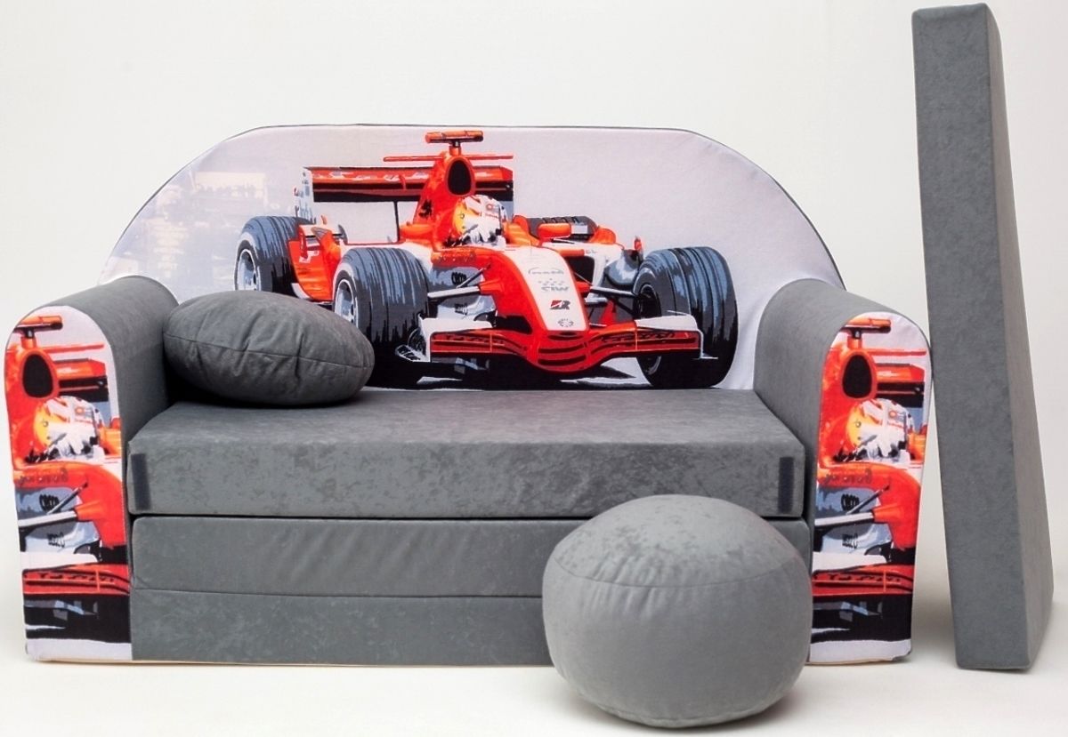 Gray children's sofa with a red formula print, lightweight and easy to move. .. more