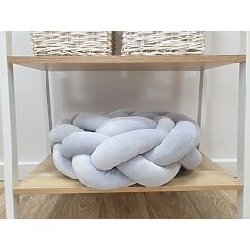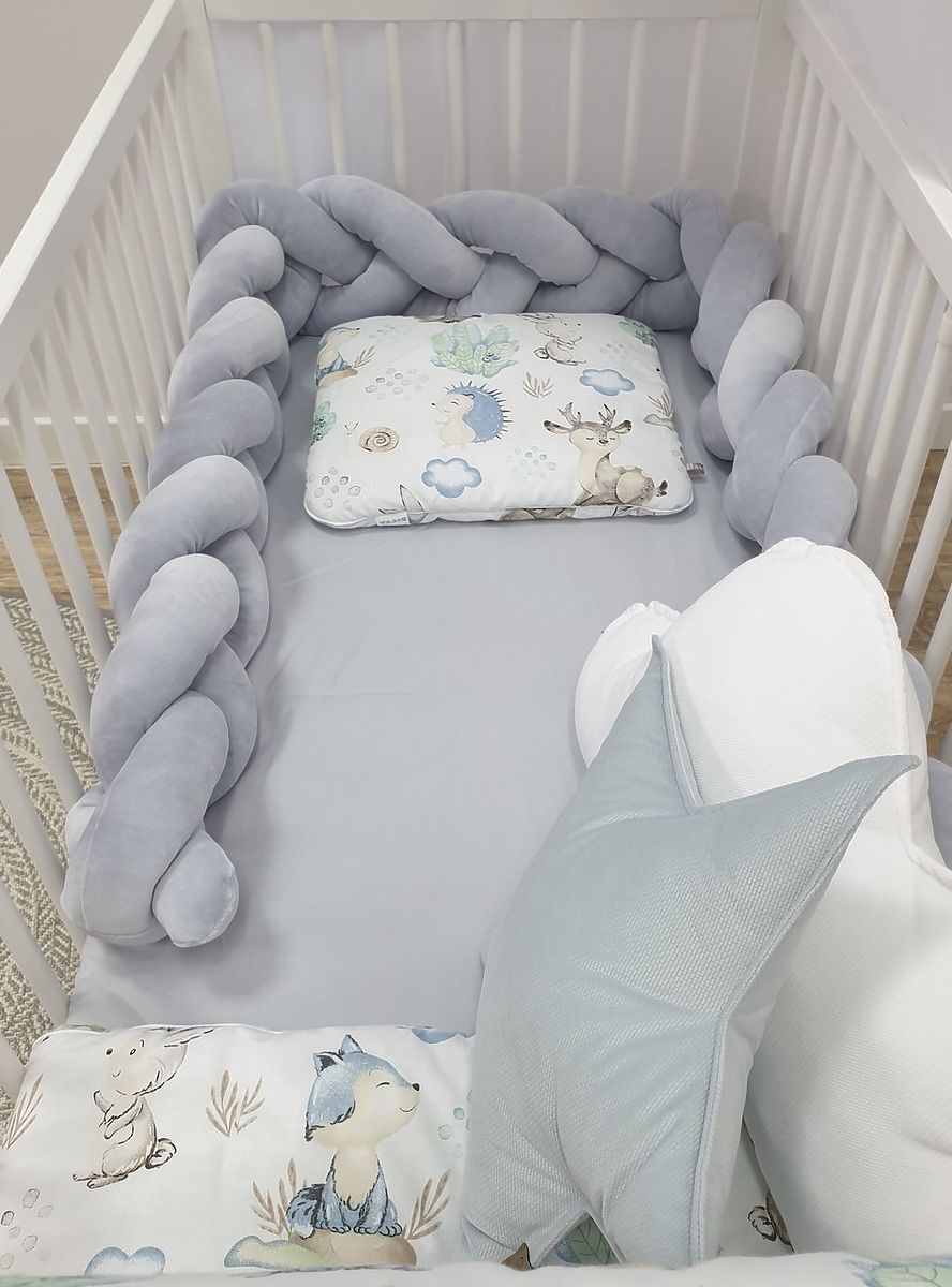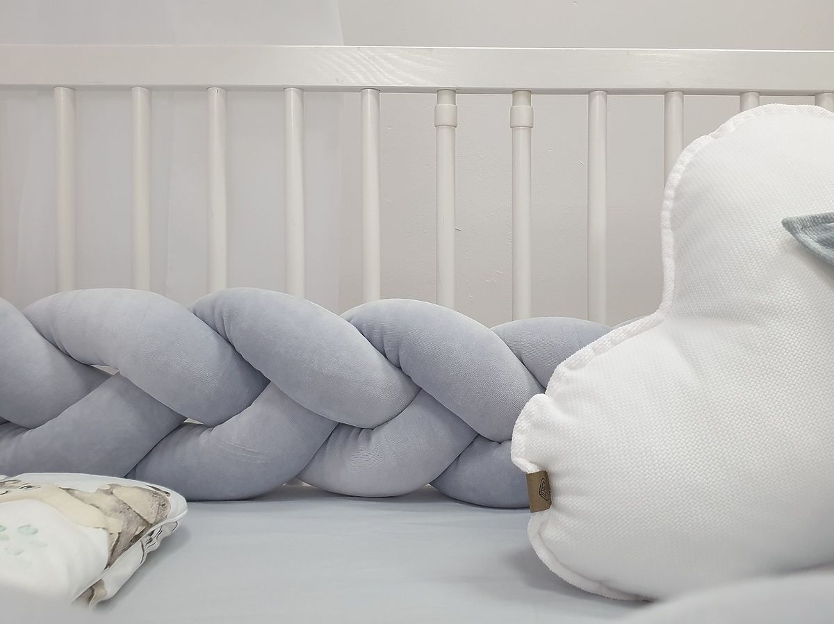 The grey braided bumper is a modern, stylish decorative element for any baby crib. It ensures safety for the baby while moving in the crib.