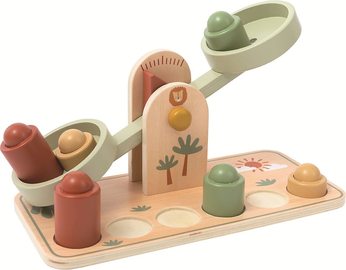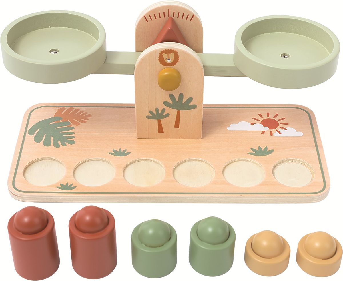 A colorful children's bowl scale in pastel colors with a safari theme is a great tool for the first exploration of the world of weighing and comparing. Inspired by Montessori pedagogy, it supports the development of logical thinking and fine motor skills. With six weights of three different masses (two of each), children learn to recognize differences in weight and explore on their own which object is heavier or lighter. Is the plush toy heavier than the doll? Compare the weights of toys in the children's room or small household items. The scale is perfect for playful learning at home and in kindergarten. Main features: 7 pieces bowl scale with 6 weights develops logical thinking and fine motor skills inspired by Montessori pedagogy learning through play suitable for children from 3 years old