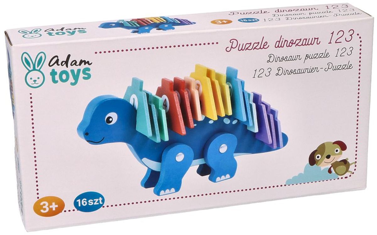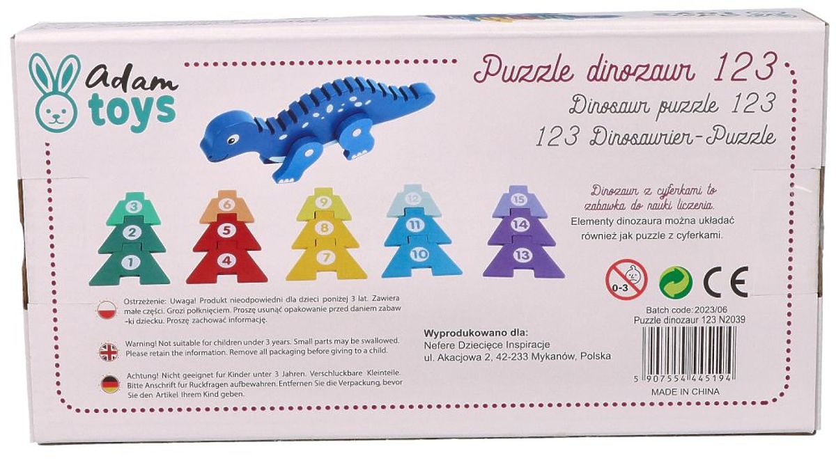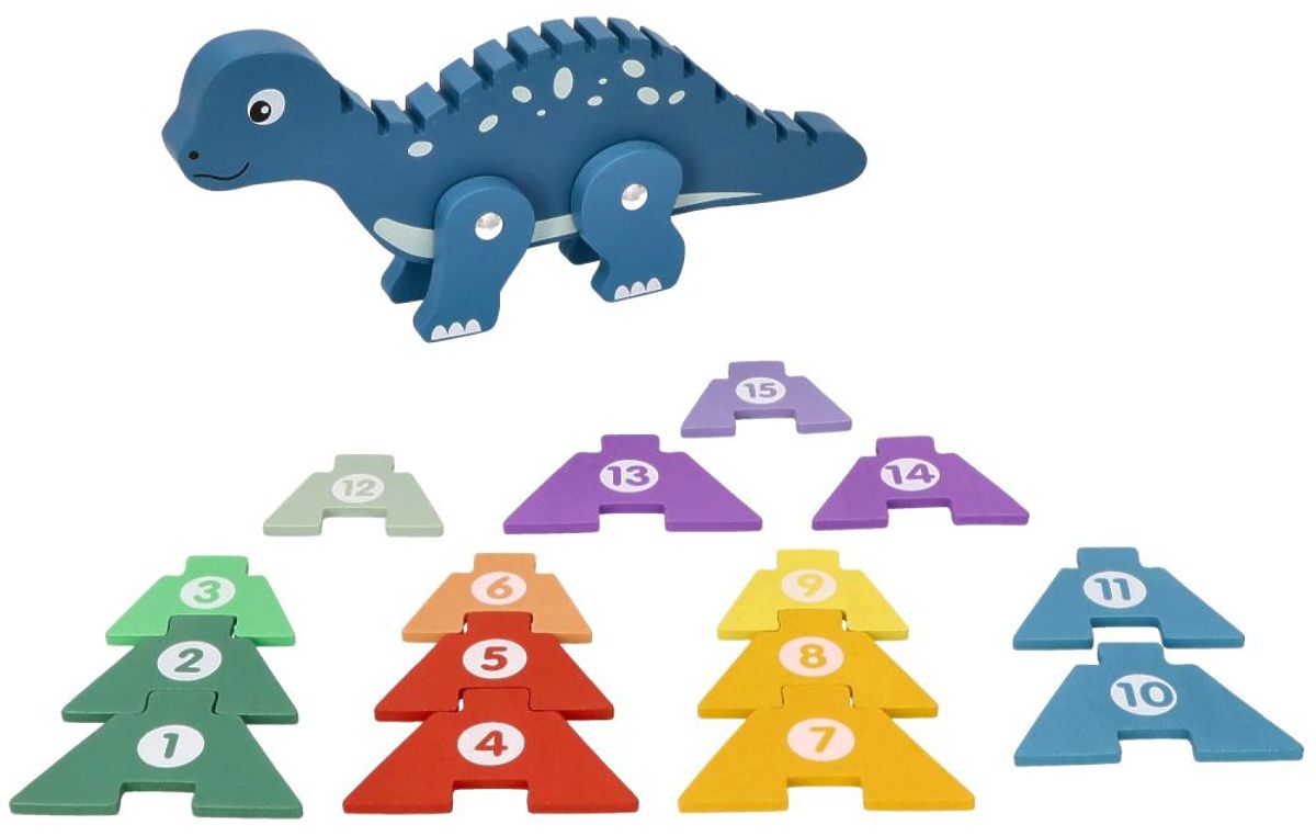 Wooden dinosaur with a complete set of numbers from 1 to 15. Helpful in learning to count. The colorful puzzle can be assembled on the dinosaur's back, which makes storing them easier. Package dimensions: 25 x 13.5 x 5 cm Age: 3+ Reference: N2039 CE Declaration of Conformity