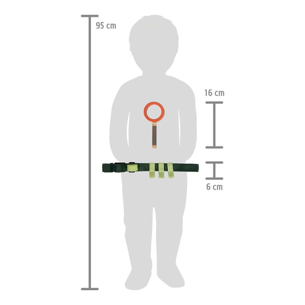 For adventure lovers! This belt with equipment keeps children's hands free during every adventure. It comfortably holds all the gear: a sturdy wooden whistle, magnifying glass, tweezers, compass, rope, and a nylon bag that can be attached to the belt loop or carabiner. The belt is easy to fasten with a buckle and is also adjustable in size. It's perfect for trips, hikes, and expeditions, allowing children to explore and discover new things in the garden, forest, or meadow. Visible wood, rounded edges, and natural colors are the hallmarks of the "Discover" toy range. Main features: durable belt for young explorers with loops and carabiners adjustable size includes wooden whistle, magnifying glass, tweezers, compass, rope, and fabric bag attractive design with visible wood and rounded edges matches other products in the "Discover" range