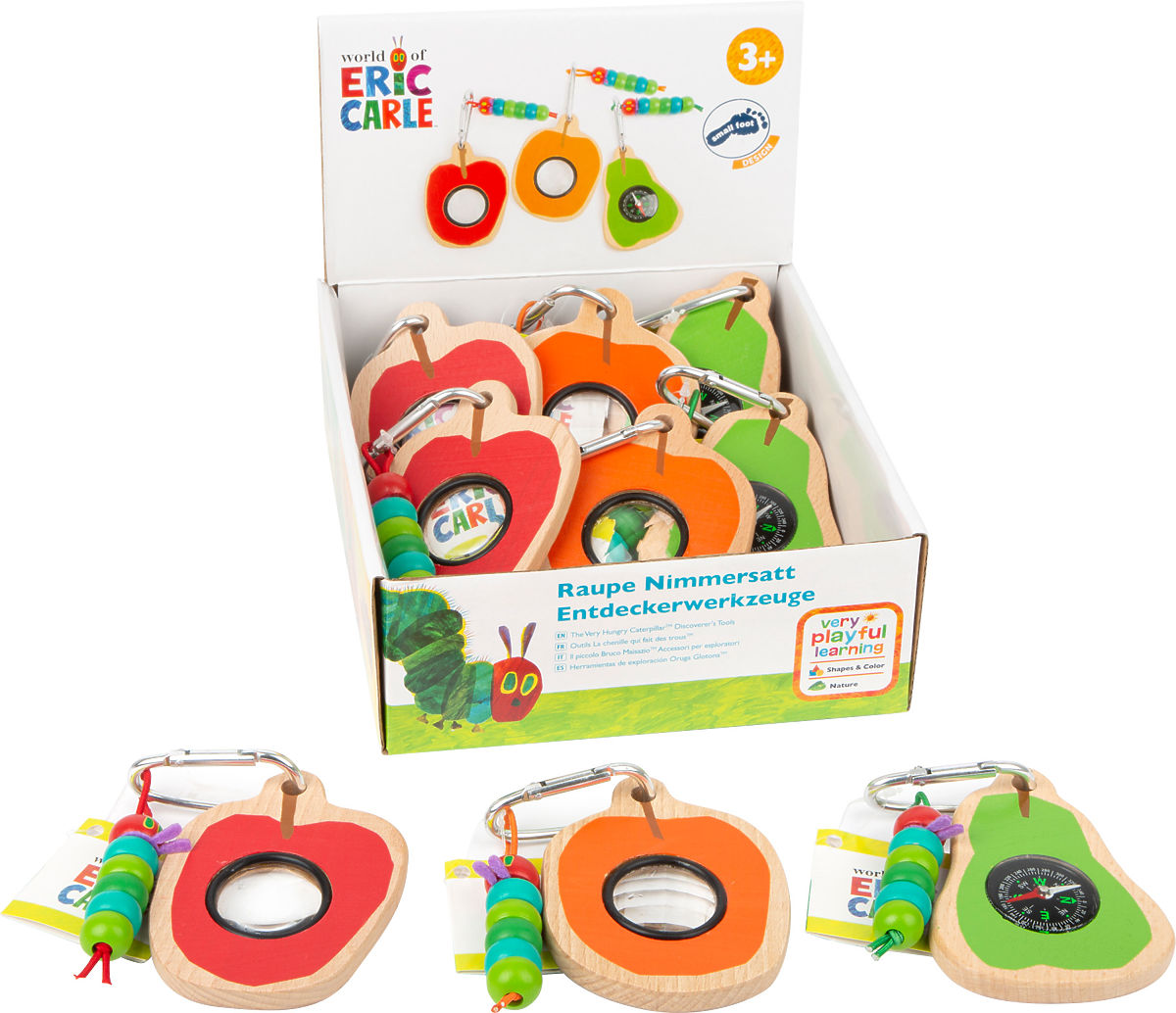 Become researchers and explore the world with one of these Caterpillar explorer tools featuring the Hungry Caterpillar motif. The compass shows which direction young explorers are moving while they observe everything with the magnifying glass. Thanks to the practical carabiner, it can be attached to a belt case or backpack, ensuring nothing gets lost on the discovery journey. This cute wooden toy is an absolute must-have for every little explorer and scout. Main features: with a cheerful Hungry Caterpillar motif, can be attached to a belt case or backpack, durable design