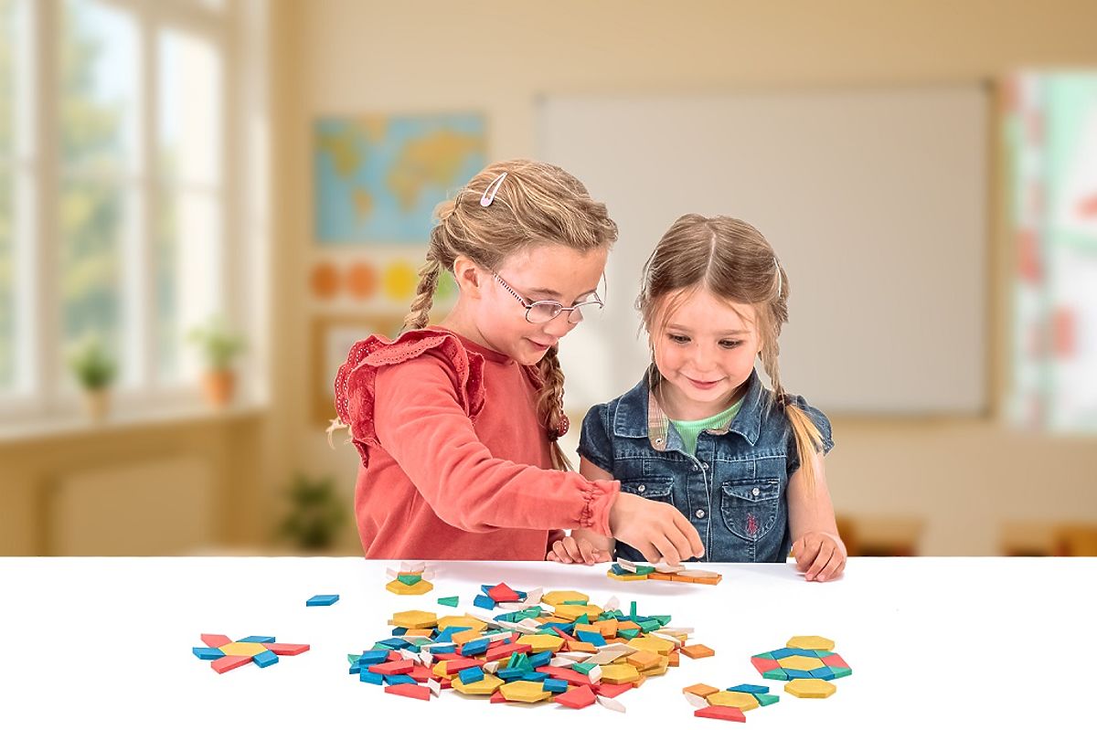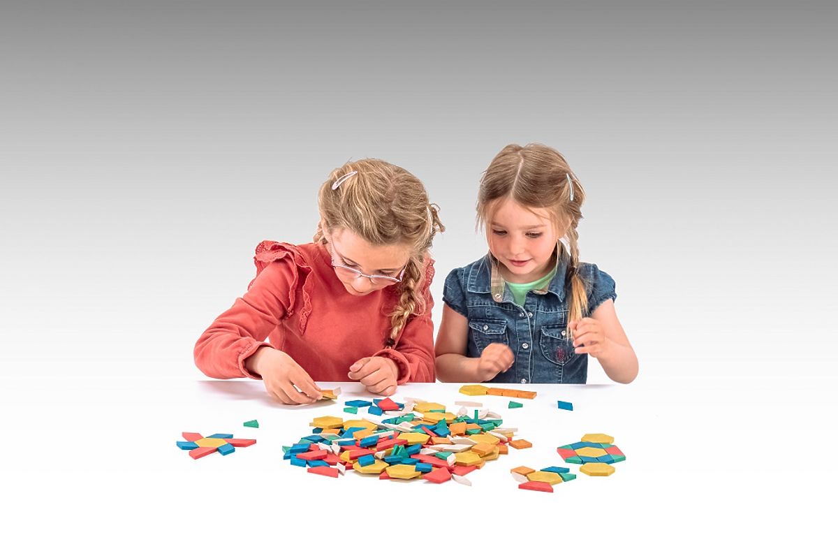 250 colorful pieces in 6 geometric shapes, designed for both play and learning about shapes and colors. Engage your creativity and assemble 3D images. Decorations, animals, numbers, ornaments, or mandalas. Children learn to discover symmetry and name different shapes and surfaces. The set includes 25 yellow hexagons, 25 orange squares, 50 red trapezoids, 50 green triangles, 50 blue parallelograms, and 50 beige rhombuses. Made from 100% recycled materials, it is PEFC certified and can be recycled again after use. Main features: contains 250 pieces, first playful experiences with geometry, includes instructions and 20 different assembly options, made in Germany.