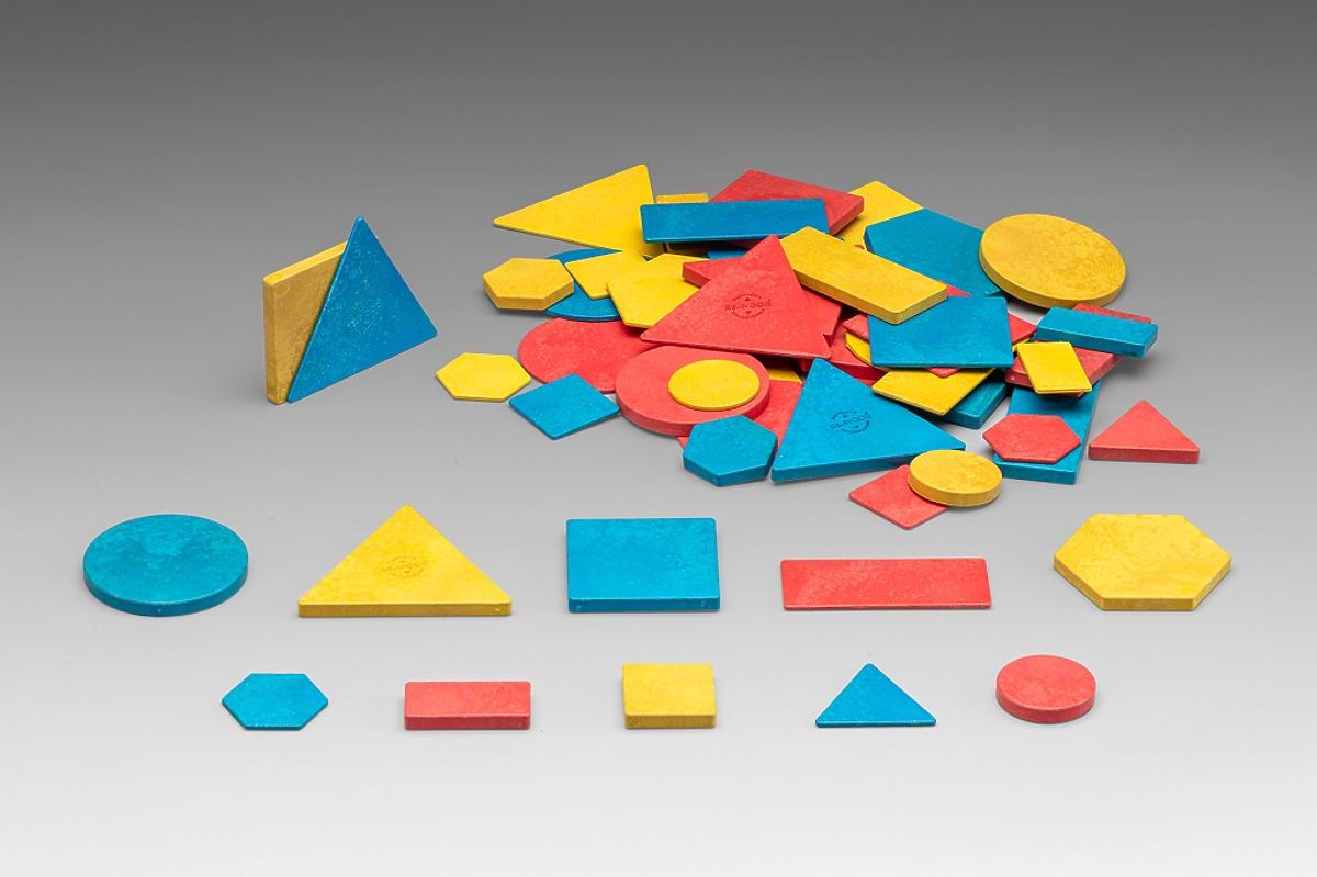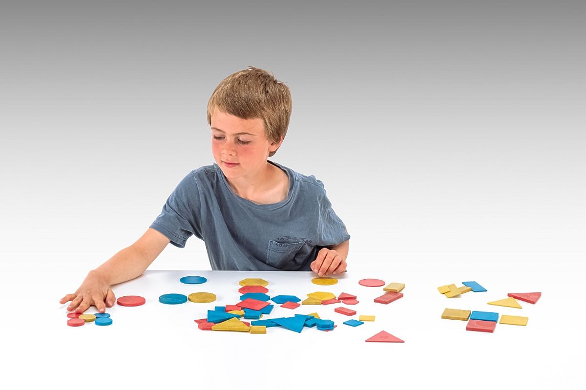 60 wooden geometric shapes made from recycled wood, designed for playing and learning about shapes and colors. 5 different shapes (square, triangle, rectangle, circle, hexagon) in 2 sizes (large square 5.5x5.5 cm, small square 3.2x3.2 cm) in 3 colors (red, yellow, and blue) and in 2 thicknesses (0.2 cm and 0.6 cm). Learn to name and distinguish geometric shapes. Create identical patterns from these logical blocks, recognize them by color, shape, size, or thickness. Made from 100% recycled materials, PEFC certified, and can be recycled repeatedly after use. Main features: contains 60 pieces, 5 different shapes, 2 sizes, 3 colors, 2 thicknesses, first playful experiences with geometry, shape and color recognition, memory skills training, made in Germany.
