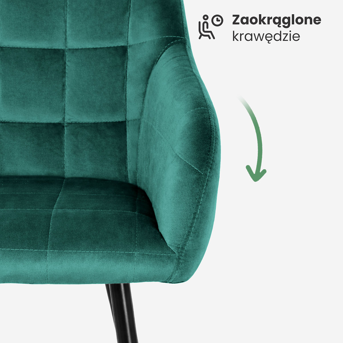 Bottle green velvet chairs with square stitching and black legs. .. more