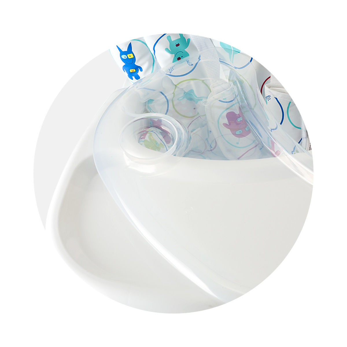 Included are a 5-point adjustable harness and a double tray. The top tray can be removed and cleaned. Thanks to the T bar, the tray protects children from falling out. Three tray positions available according to child's age.