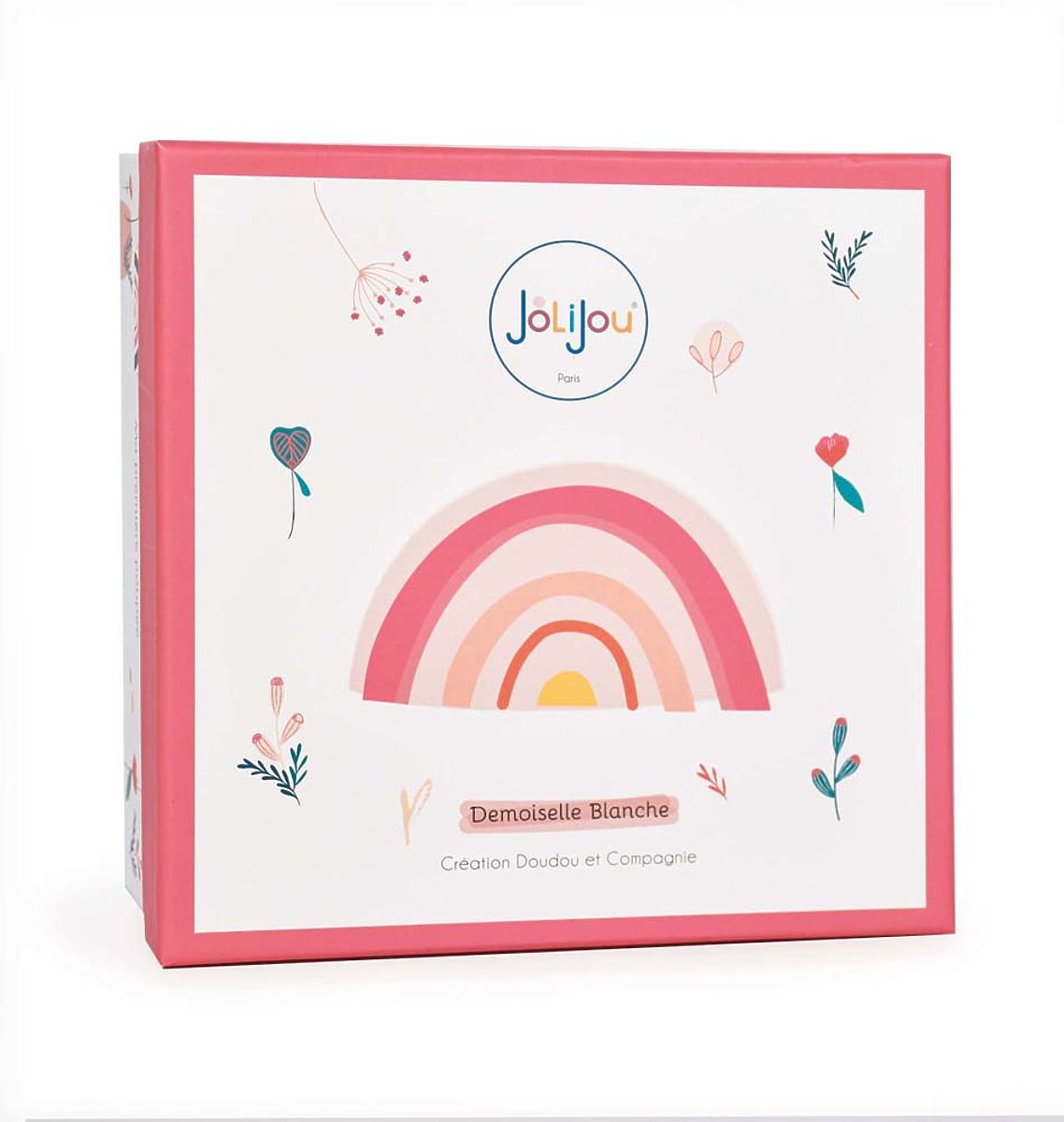 The Blanche doll in white dress is the perfect companion for your little girl. The doll has embroidered eyes, nose, and mouth. Sit the doll down and entertain your child by styling her brown curly locks. Additionally, Miss Blanche always has a small cherry-colored teddy bear friend attached to her hand. Care: Wash in a bath at 30°. Recommendation: Natural or low-temperature drying. The toy meets European CE safety standards. Delivered in a gift box. Main features: doll with teddy bear, suitable from birth, cotton face, embroidered eyes, nose, and mouth, adjustable chestnut curls