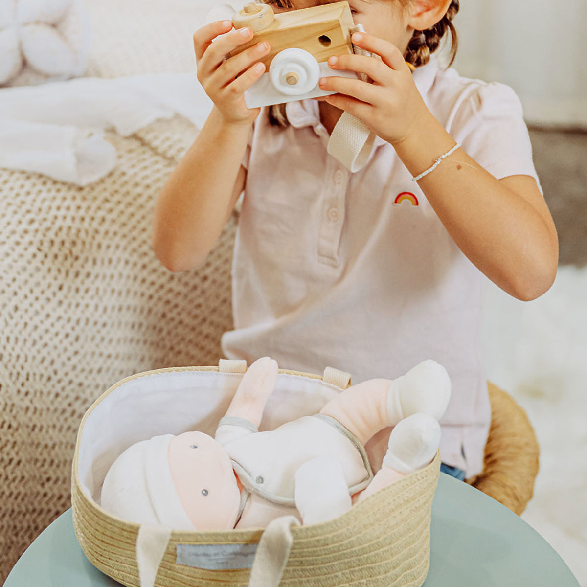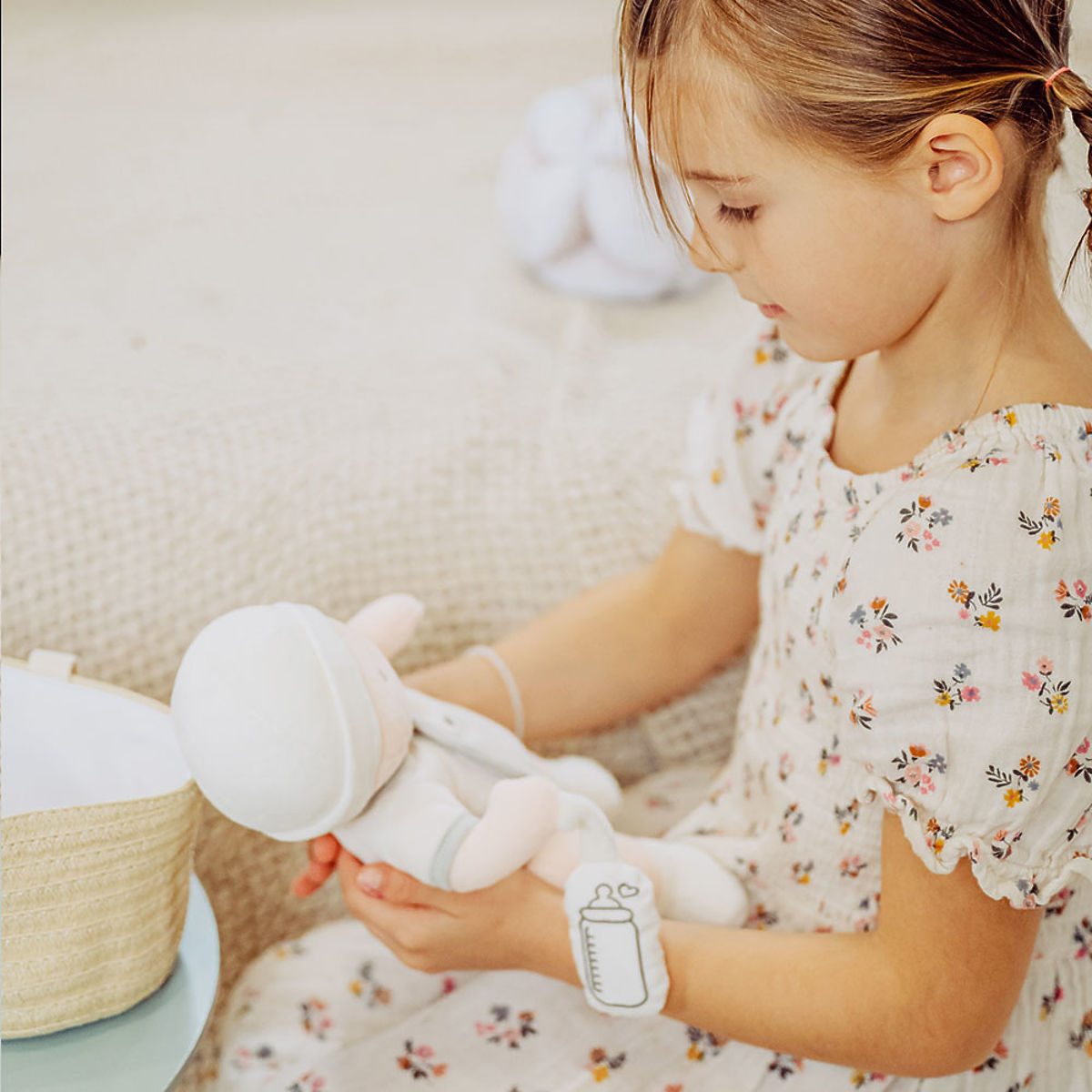 Doll Pol in a portable stroller bag like a real baby! This doll with a cap and socks is soft and cuddly for every little hand. Pol also has a white-gray outfit that can be taken off and put back on, and holds a small bottle in her hand. Thanks to the portable stroller bag, Doll Pol is a great companion not only at home but also for trips to the park or visiting friends. Hours of playtime are guaranteed with this doll. Care: Wash in a bath at 30°. Recommendation: Natural or low-temperature drying. The toy meets European safety CE standards. Main features: suitable from birth, embroidered face, eyes, and mouth, sweet baby with accessories.