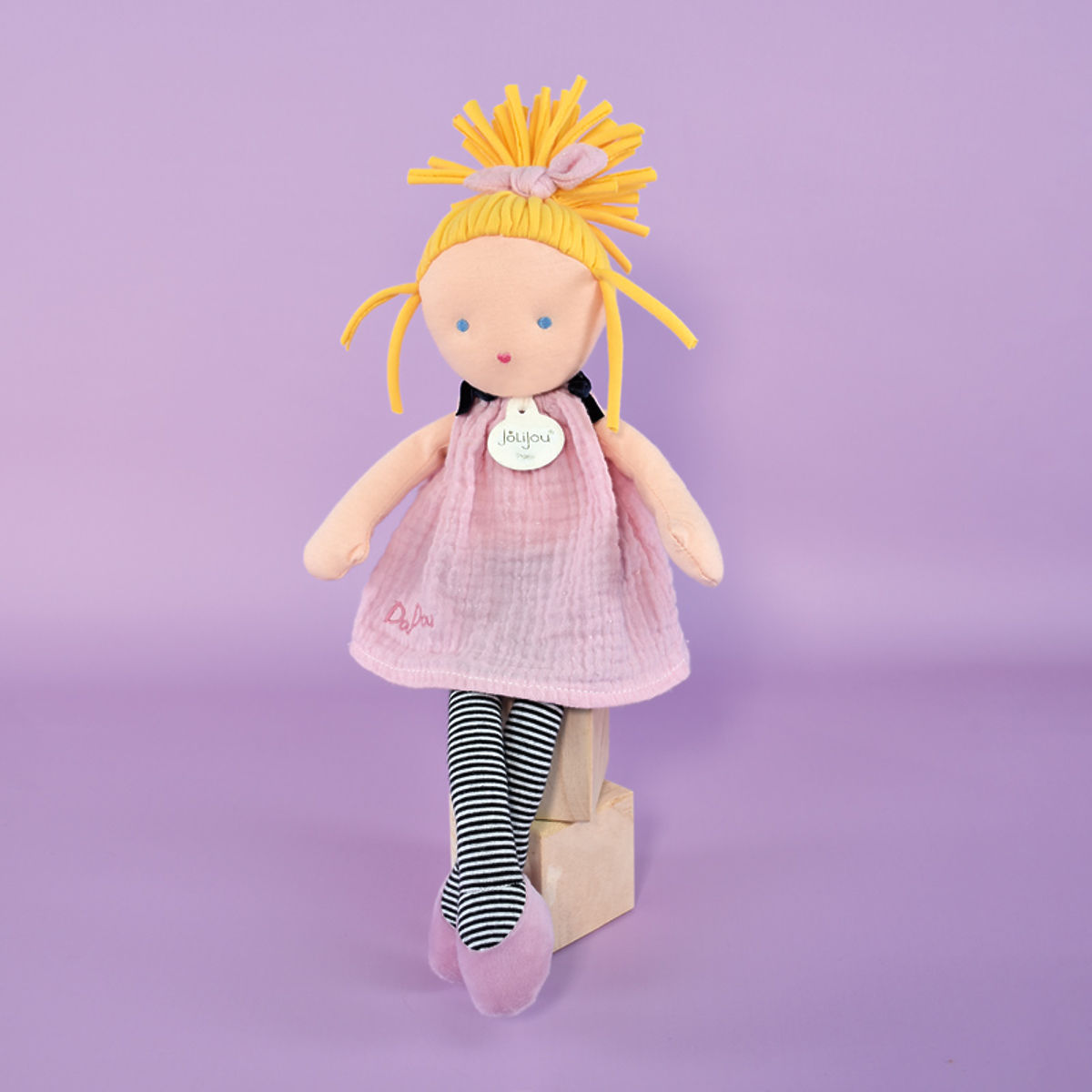 This adorable doll has her own boho style. Doll Inés is dressed in striped stockings. Her pink ballet shoes and pink dress perfectly accentuate her style. To be even more chic, she has her "spaghetti" blonde hair tied in a ponytail. The doll comes in a gift box. Care: Wash in a 30° bath. Recommendation: Natural or low-temperature drying. The toy meets European safety CE standards. Main features: suitable from birth, cotton face, embroidered eyes and mouth stitched into a heart shape, doll with accessories, in a gift box.