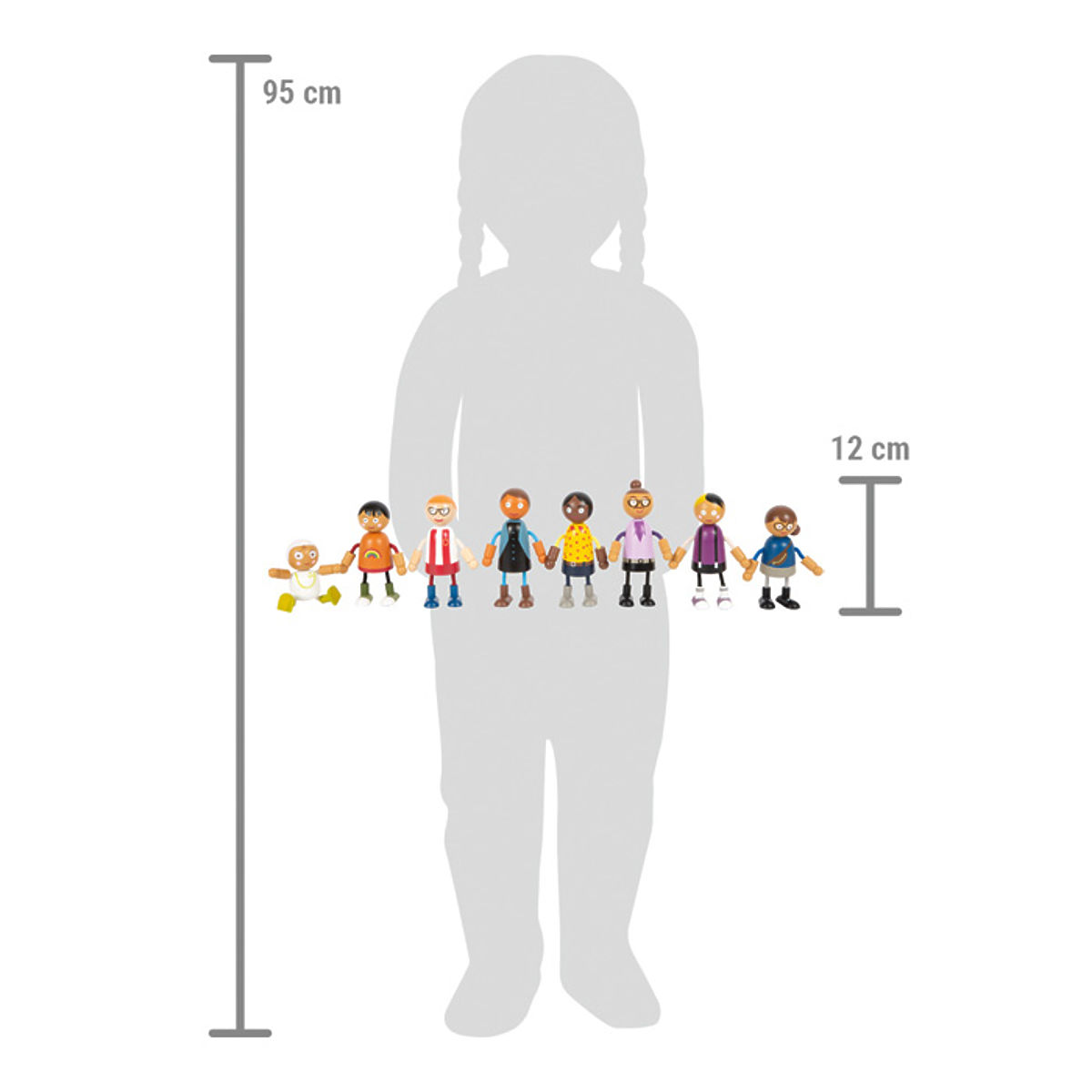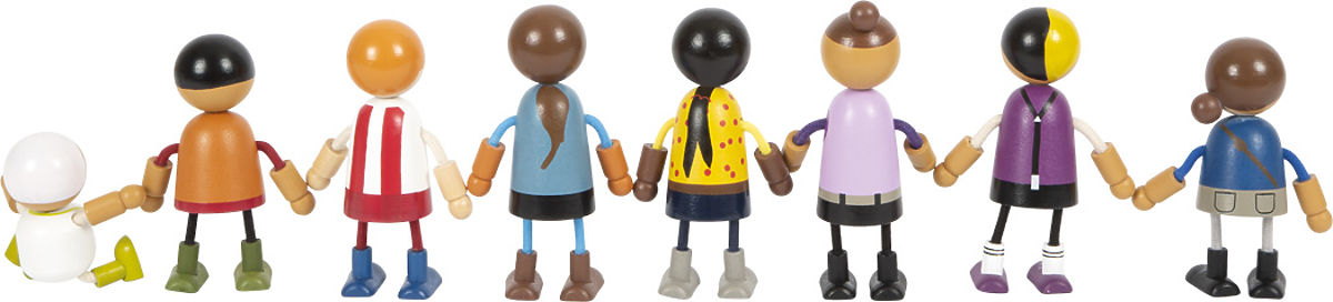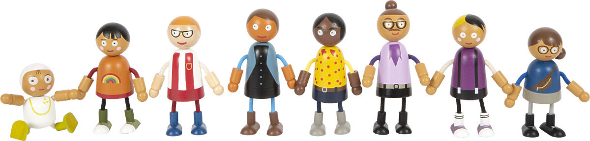 This large family of wooden bendable dolls is suitable for any dollhouse. It consists of 8 family members of different genders and ages. The bendable dolls have heads and bodies made of solid wood, while their arms and legs are textile and flexible. Two pairs of parents, three children, and a baby in a carrier that can be attached to other bendable dolls offer plenty of different play possibilities. Active role-playing teaches children in a fun way how diverse lifestyles can be. Role-playing supports the development of identification, communication, imagination, and social and emotional skills. The bendable dolls are easily graspable for small children's hands due to their size. An ideal addition to the city villa with a dollhouse (11802) or the compact city villa (12277). Main features: 8-member flexible doll family supports imagination, creativity, and social skills; realistic fun thanks to flexible arms and legs; flexible, robust with rich details; figure size is easily graspable for children's hands.