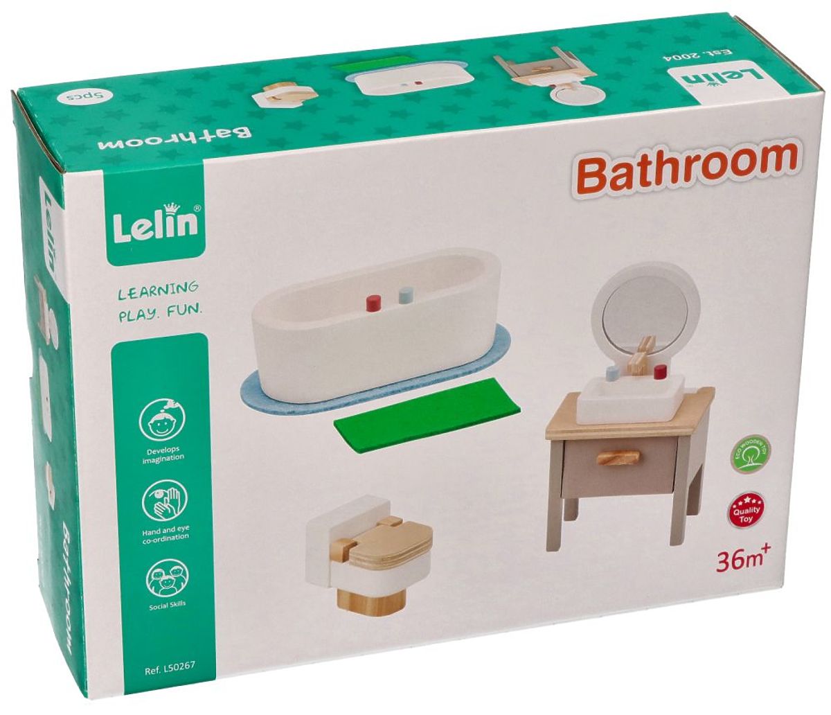 A cute set of bathroom furniture made of wood, perfect for a dollhouse. The set includes a bathtub, a sink with a mirror, and a toilet. Each element has been carefully crafted with attention to detail and play safety – all edges are smoothly sanded.