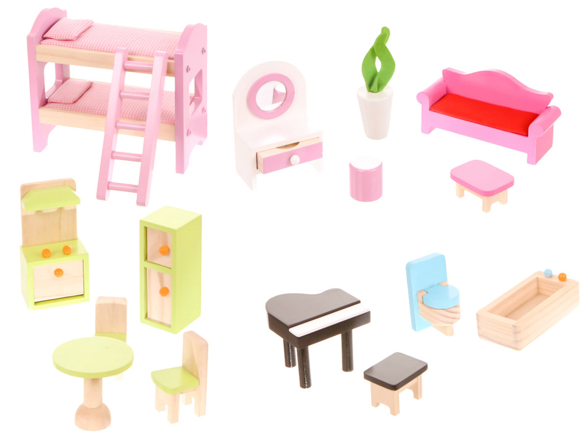 There are four rooms inside - bathroom, living room, bedroom and kitchen. All these rooms imitate a house to make playing more real. Included are 16 pieces of furniture and 4 dolls.