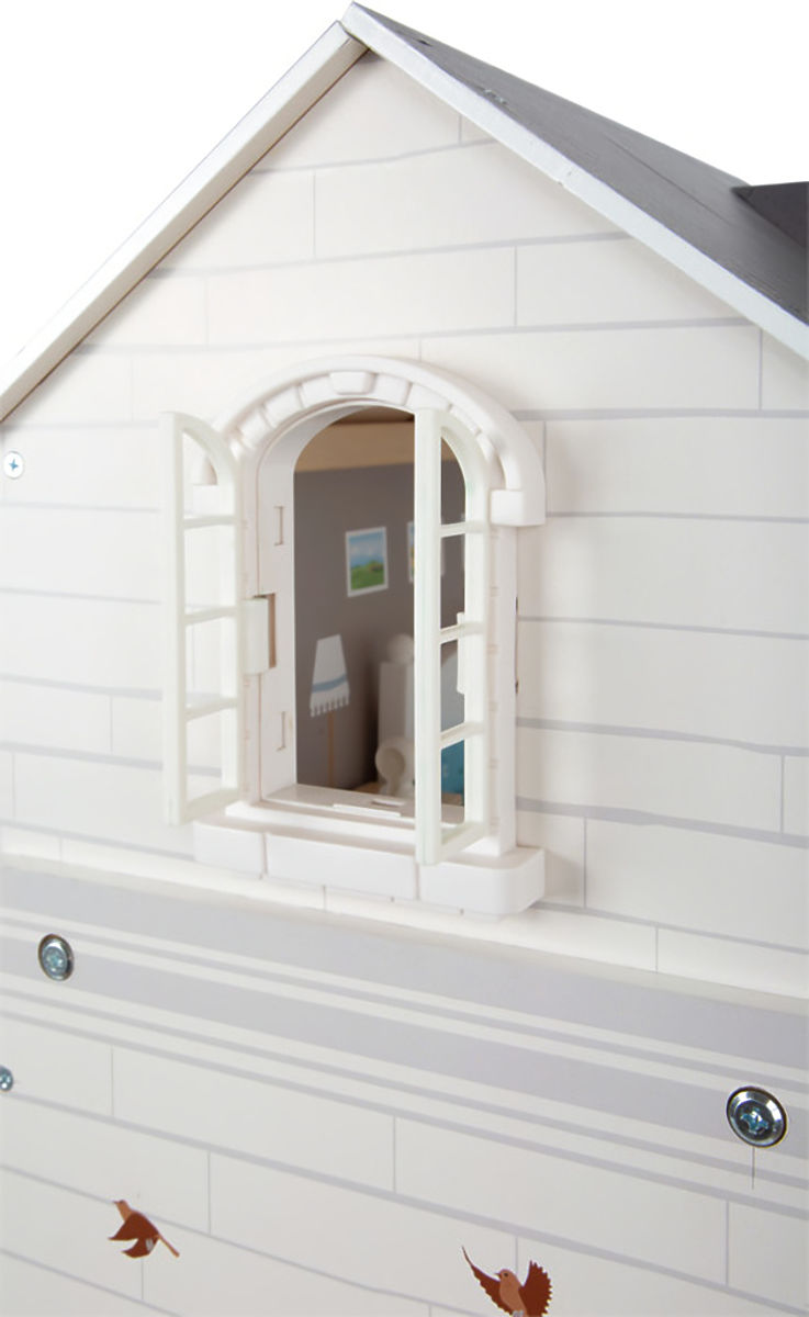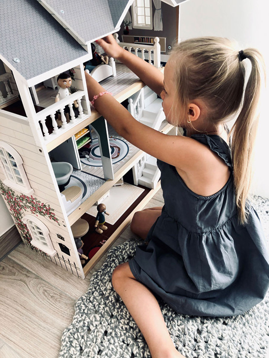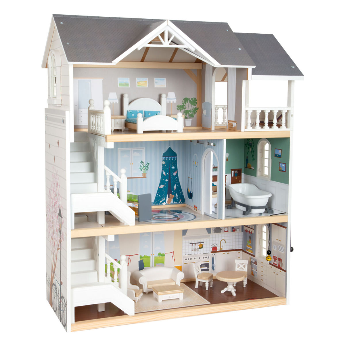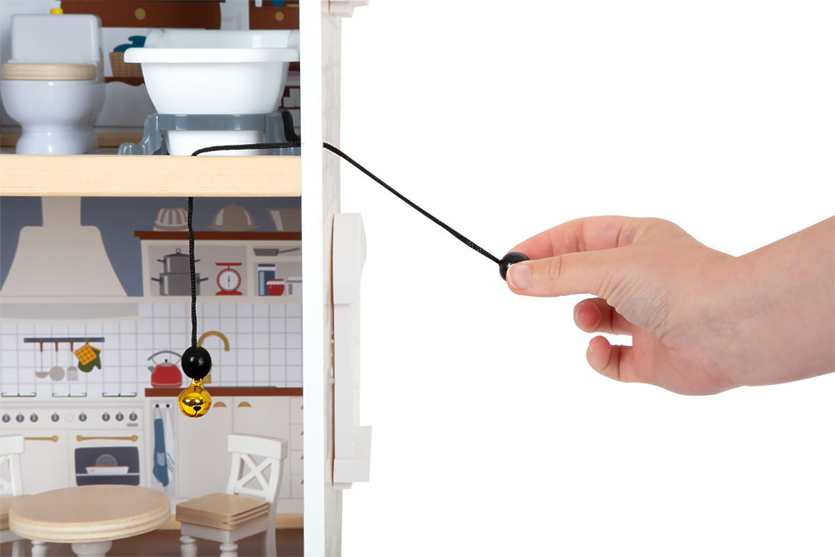 The dining room and living room, children's room and bathroom, as well as the bedroom and loggia offer plenty of space for play. Stairs, sliding doors, openable windows, nightstands with drawers, and a real bell announcing the arrival of visitors, along with 12 pieces of furniture and many accessories, make playing a perfect fun. The open front makes it easy to play and also allows several children to play with dolls simultaneously. The product requires assembly, delivered with detailed assembly instructions. A large, stable wooden dollhouse with detailed design inside and outside the house. The open front makes it easy for multiple children to play together. 3 floors connected by a staircase, 5 rooms, and a terrace offer space for play. Furniture with wooden details and plastic parts for realistic fun. Functional bell and other features like sliding doors, openable windows, nightstand with drawers. Main features: Thanks to the bright exterior facade and modern design, the villa fits into any children's or living room. Large enough for multiple children to play together. Functional bell and furniture elements. Includes 12 pieces of furniture with accessories. Suitable for dolls up to 12 cm in size (e.g., LE11804). Toy Award: Top 10 Spielzeug Nominated 2021