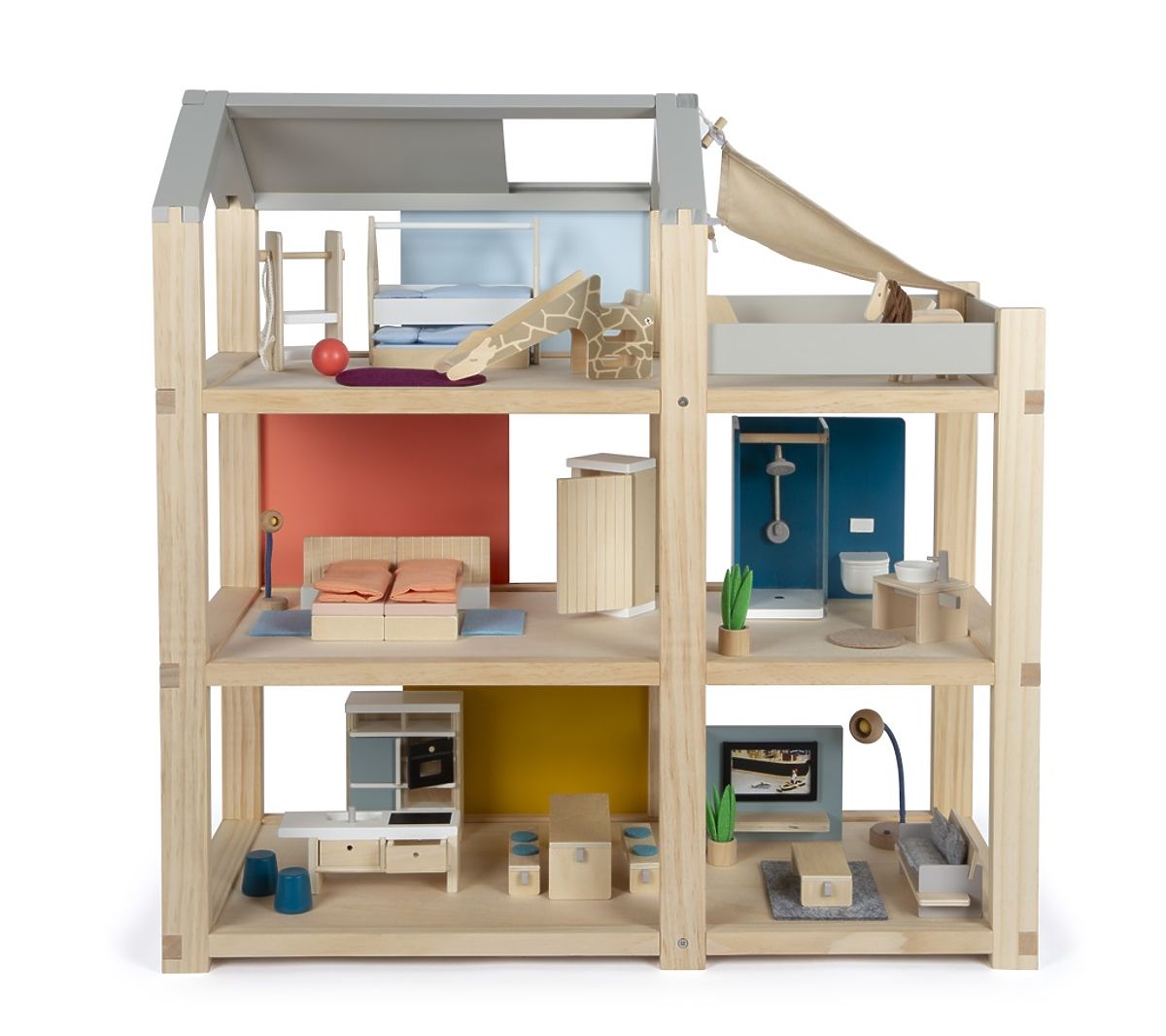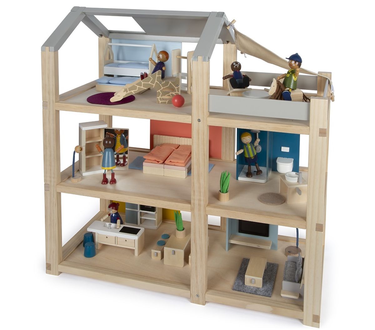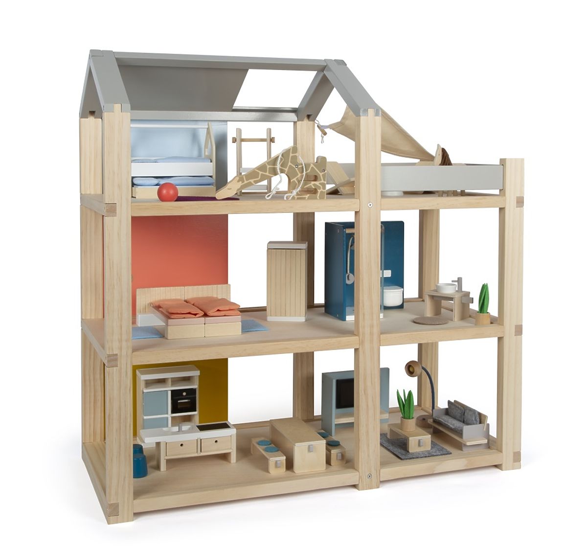 This large wooden dollhouse in Scandinavian style with three floors and a spacious rooftop terrace will not only become a fun and creative toy but also an interior accessory that will stand out in any room. The dollhouse has three floors. It consists of a cozy bedroom, a children's room with a giraffe slide, a stylish bathroom, a modern kitchen, a charming dining room, a cozy living room, a spacious rooftop terrace, and is fully furnished with intricately detailed furniture for dolls. Thanks to the sliding back walls, the interior appearance can be changed again and again. The walls are double-sided, with one side having a natural wood appearance and the other side painted in color. The dollhouse is ready for play immediately—no additional accessories are needed. Main features: for 12 cm dolls, spacious rooms and large rooftop terrace, fully furnished, open front wall facilitates play, fun and creative toy, tasteful interior accessory, supports creativity and enhances spatial perception, promotes the development of motor, speech, and social skills.