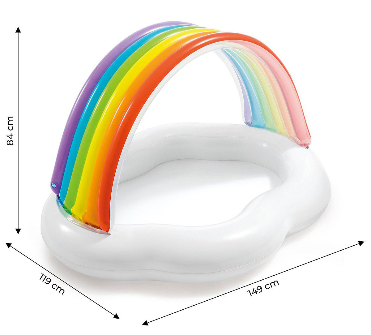 The inflatable pool has the shape of a white cloud with a colorful roof resembling a rainbow. The pool is very safe, its inflatable walls provide comfortable support and protect the toddler in the event of a fall. The roof located at the top protects them from the sun and ensures safe play in the water.