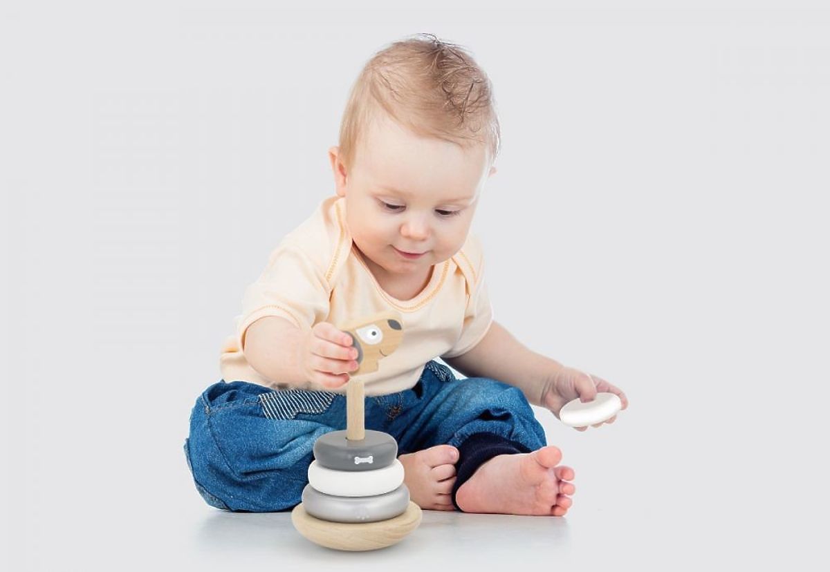 The toy develops movement coordination in a fun way and improves the child's motor skills. The toddler first learns to hit the ring on the stick. Later, he begins to differentiate the rings according to size and strings them to form a pyramid.