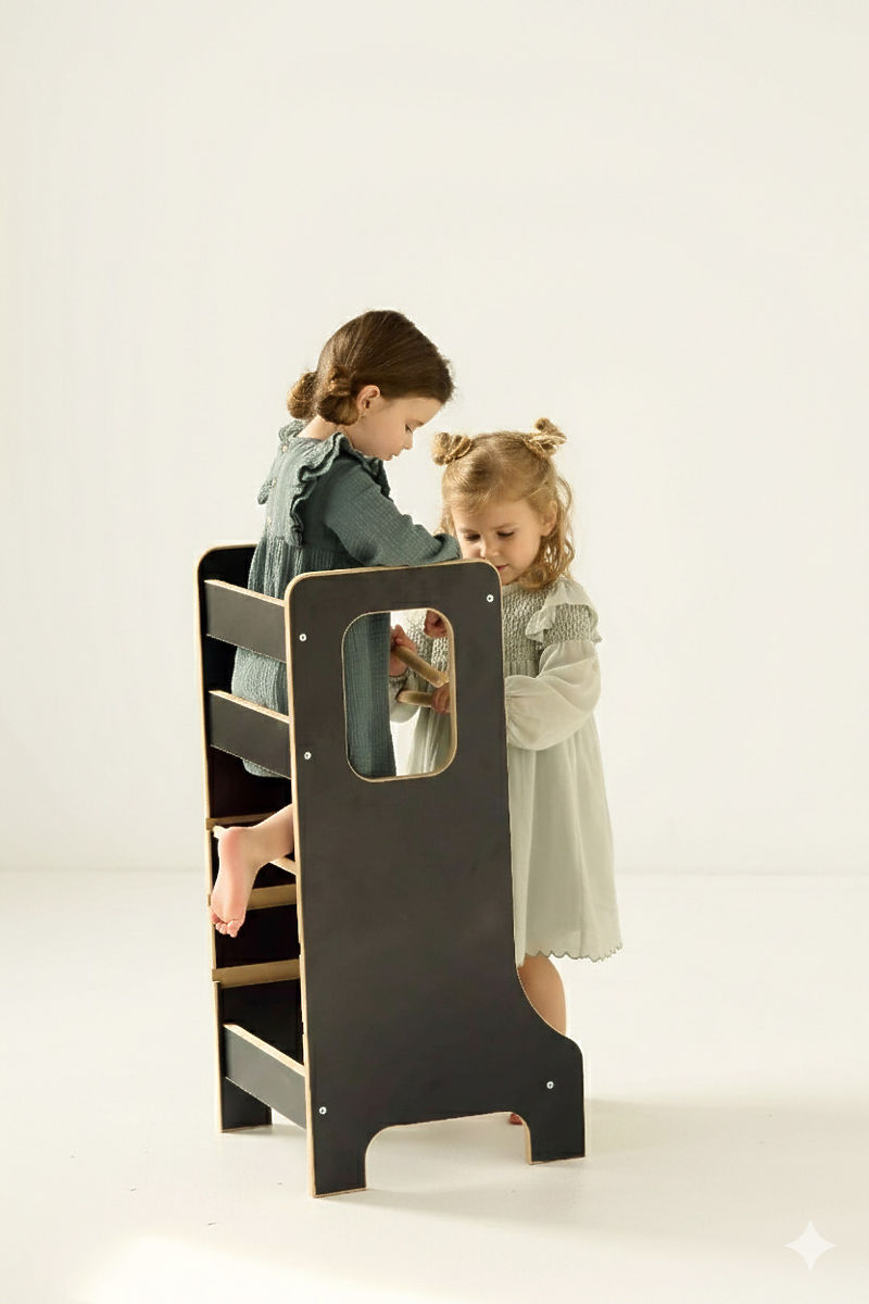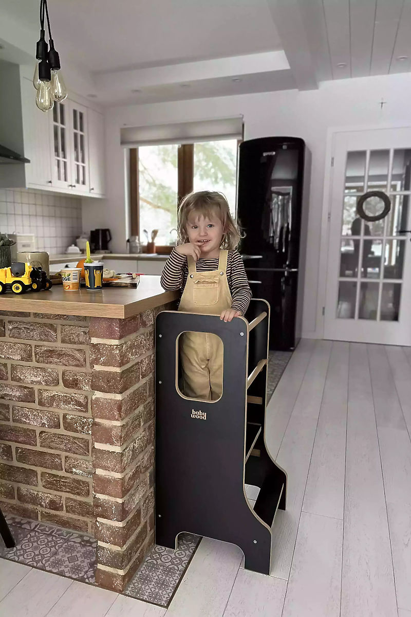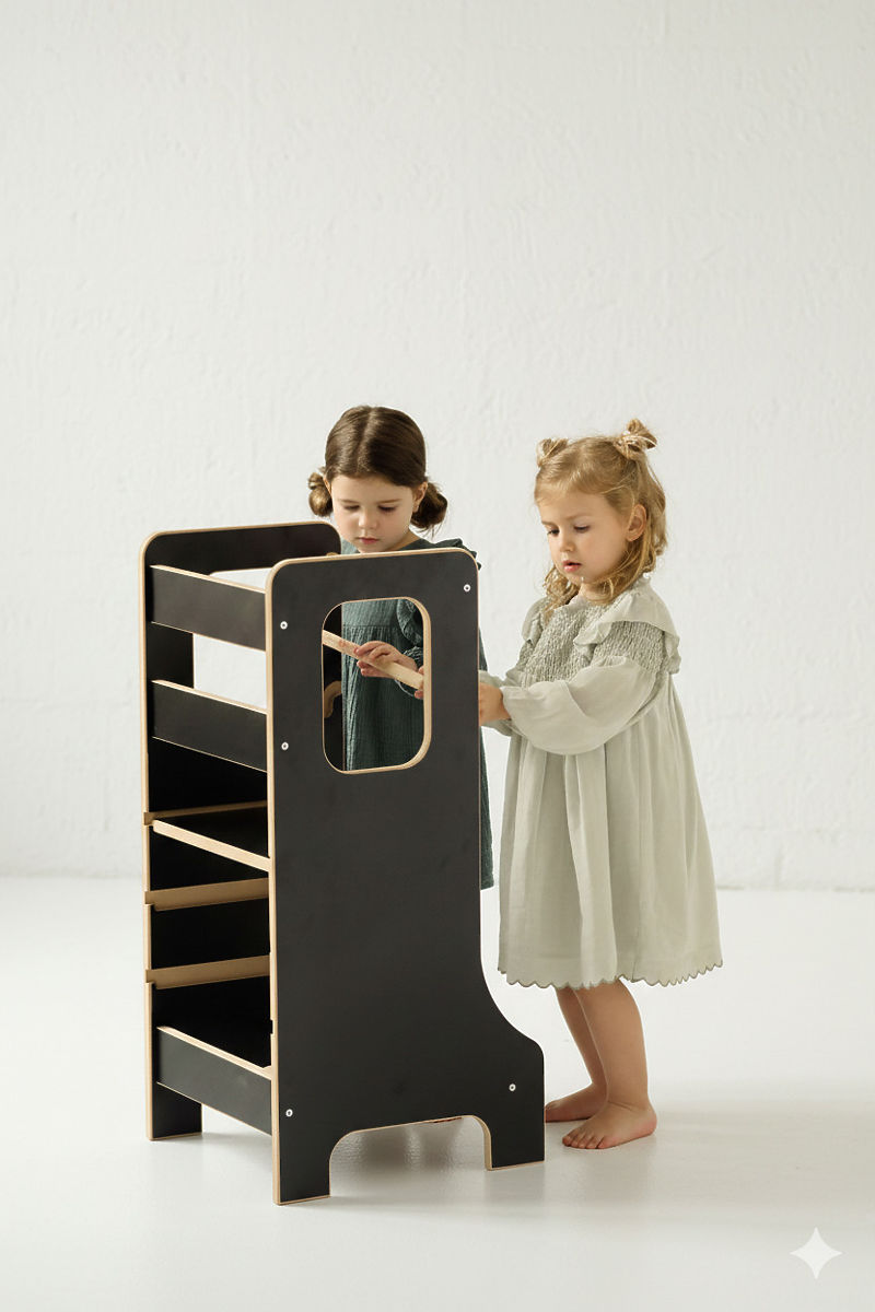 The SLIM Learning Tower in black is a stylish and practical assistant for families who want to safely involve children in everyday household activities. It allows children to stand at the right height, observe their surroundings, and actively participate in routine tasks. At the same time, it supports the development of independence, motor skills, and self-confidence in children. Thanks to its slim design, the tower easily integrates into modern interiors without taking up unnecessary space. The stable construction and thoughtful safety features ensure comfortable and safe use.