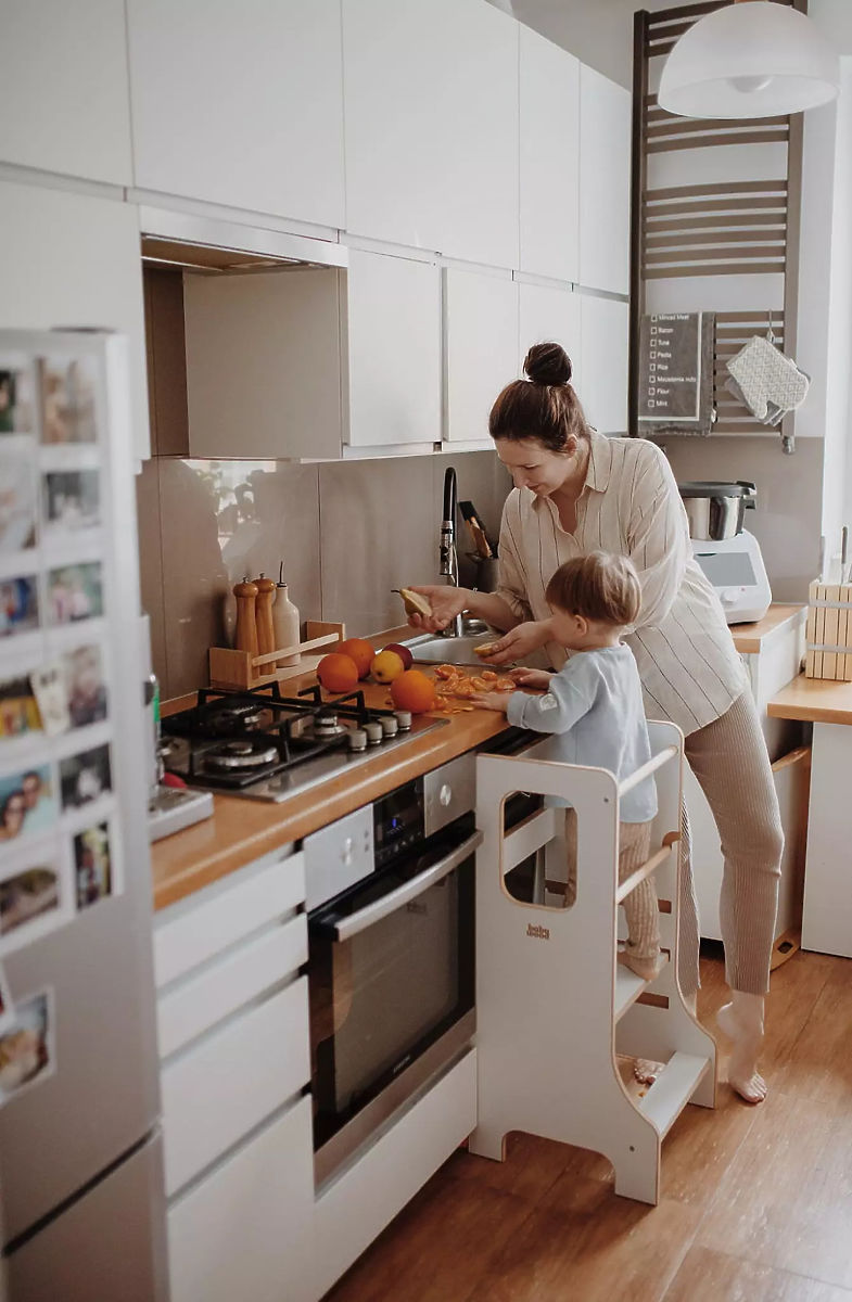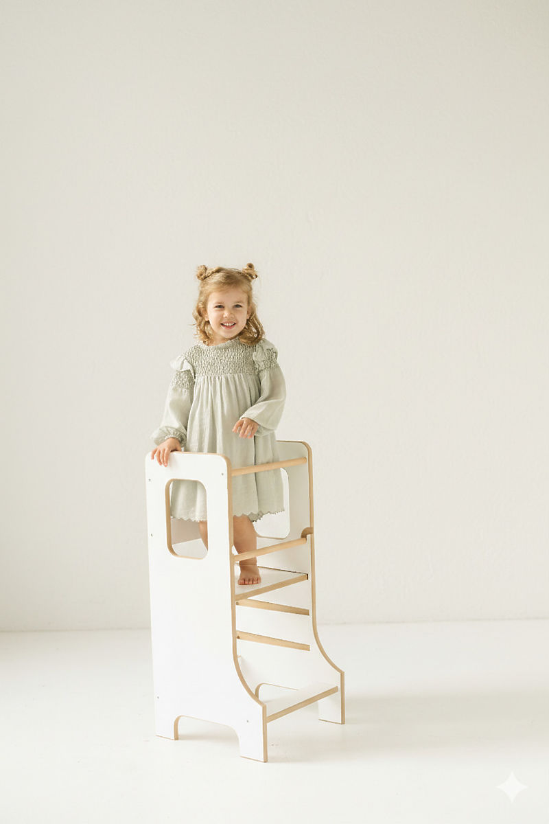 The SLIM Learning Tower in white is the perfect choice for parents who want to safely involve their children in everyday household activities and allow them to actively explore the surrounding world. Thanks to its thoughtful design, it supports independence, creativity, and the development of motor skills, helping children naturally gain new experiences. Shared moments spent cooking or engaging in other activities turn into fun and valuable experiences. The slim design of the SLIM version appears elegant and does not take up unnecessary space, yet remains stable and safe. Children can independently climb into and safely descend from the tower, boosting their confidence and independence.