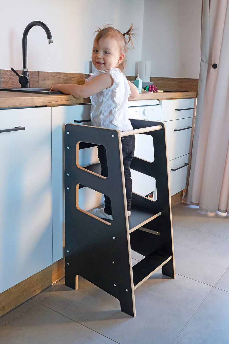 The children's Montessori learning tower in black will stylishly complement any interior. Through this practical learning tower, involve your children in everyday activities, enable them to actively learn new things and discover the world around them. It is a reliable and practical helper, thanks to which it is possible to develop not only children's creativity and motor skills, but also contributes to the overall development of the child's personality and socialization.