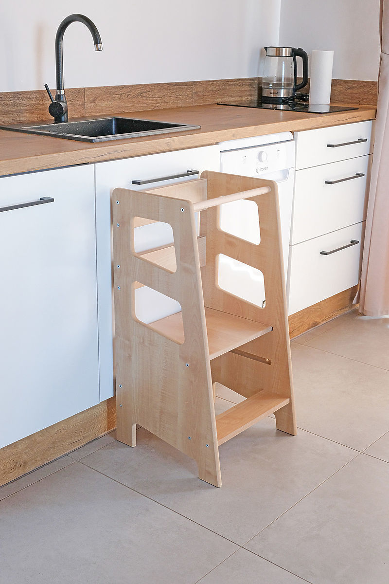 Children's montessori learning tower in brown design with trapezoidal cutouts. It is a reliable and practical helper that develops creativity, motor skills and .. more